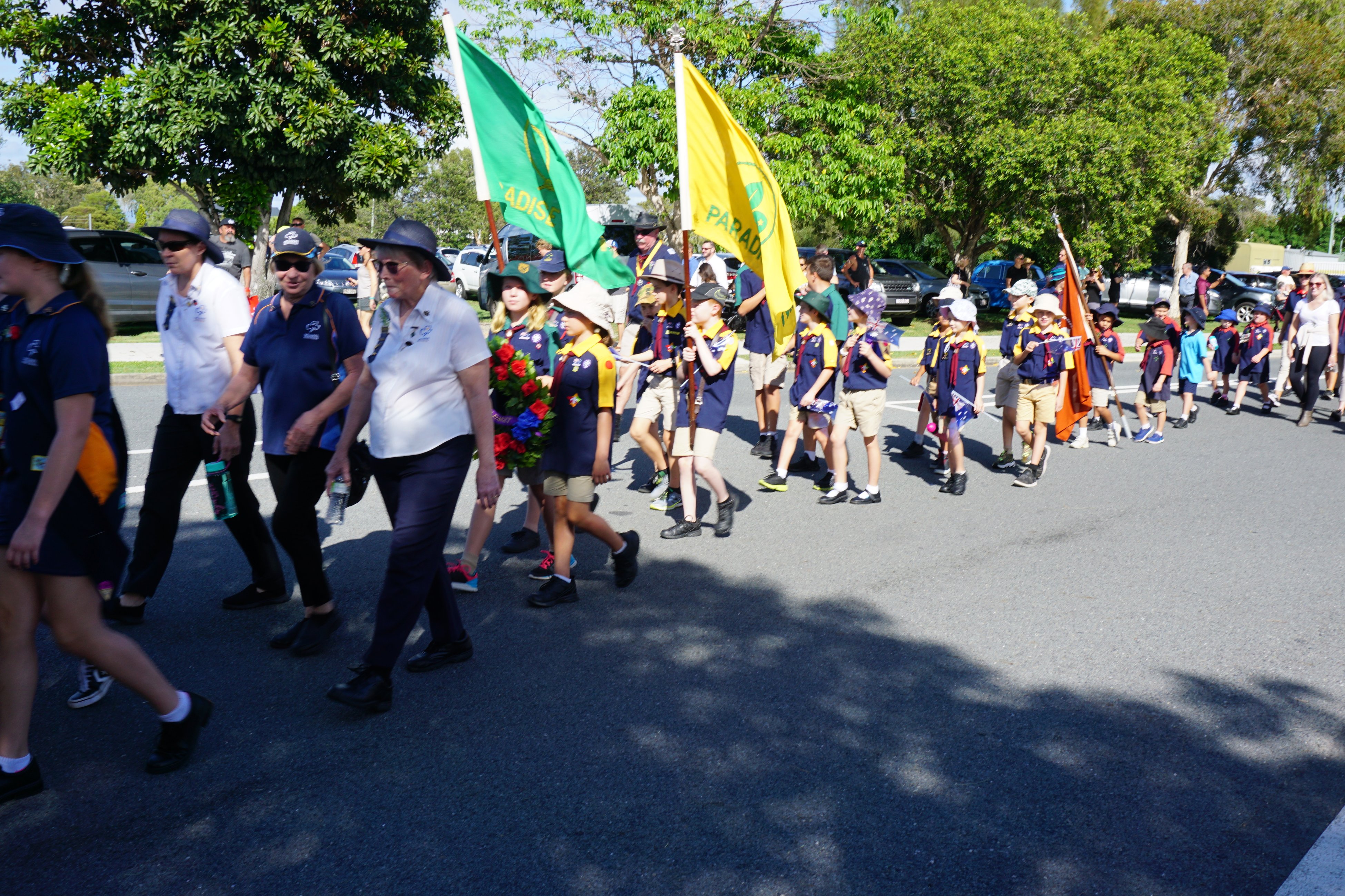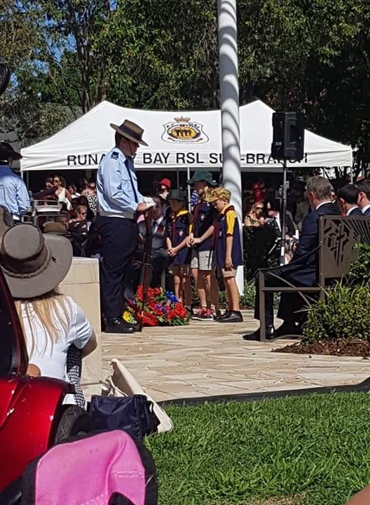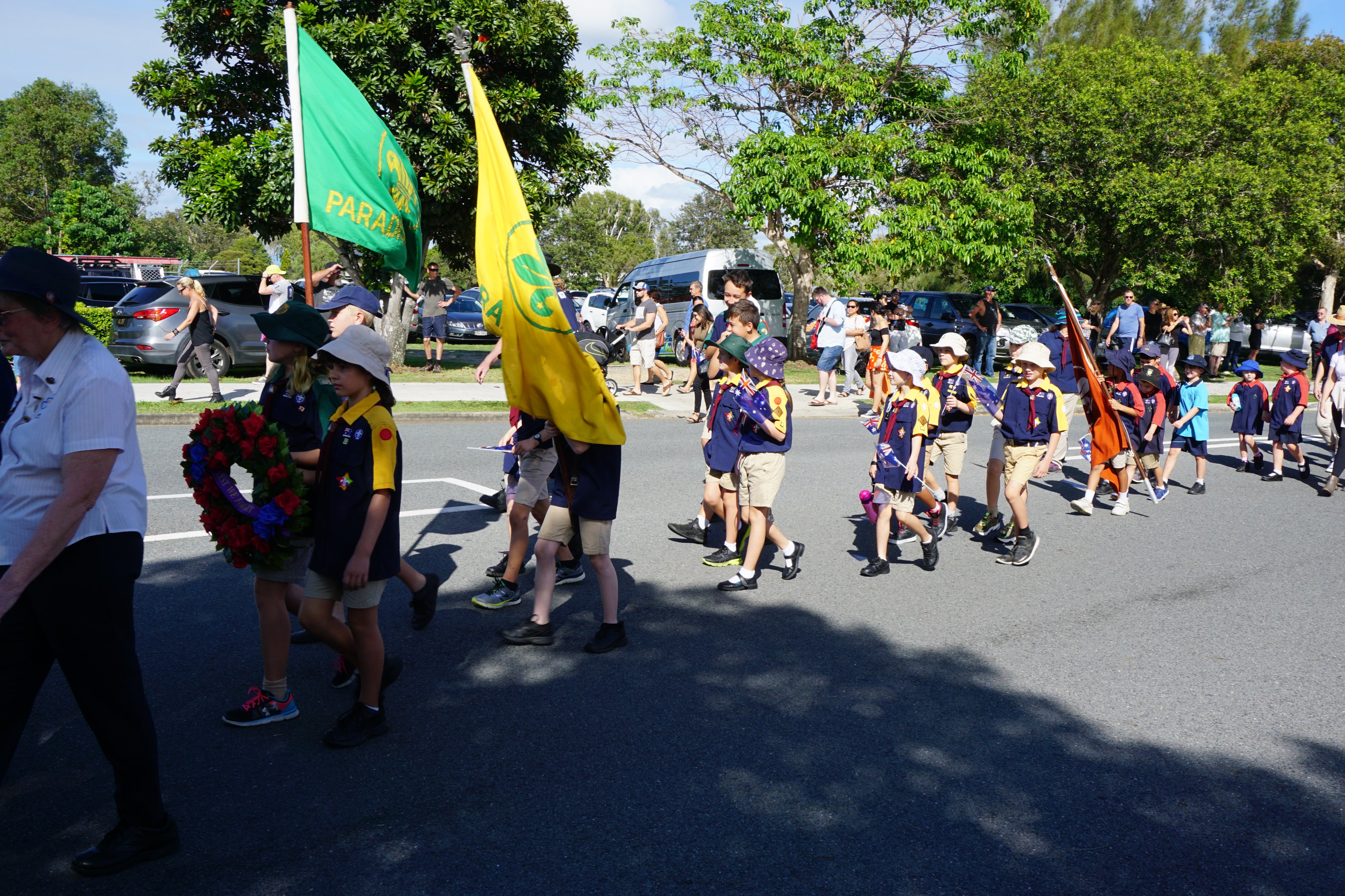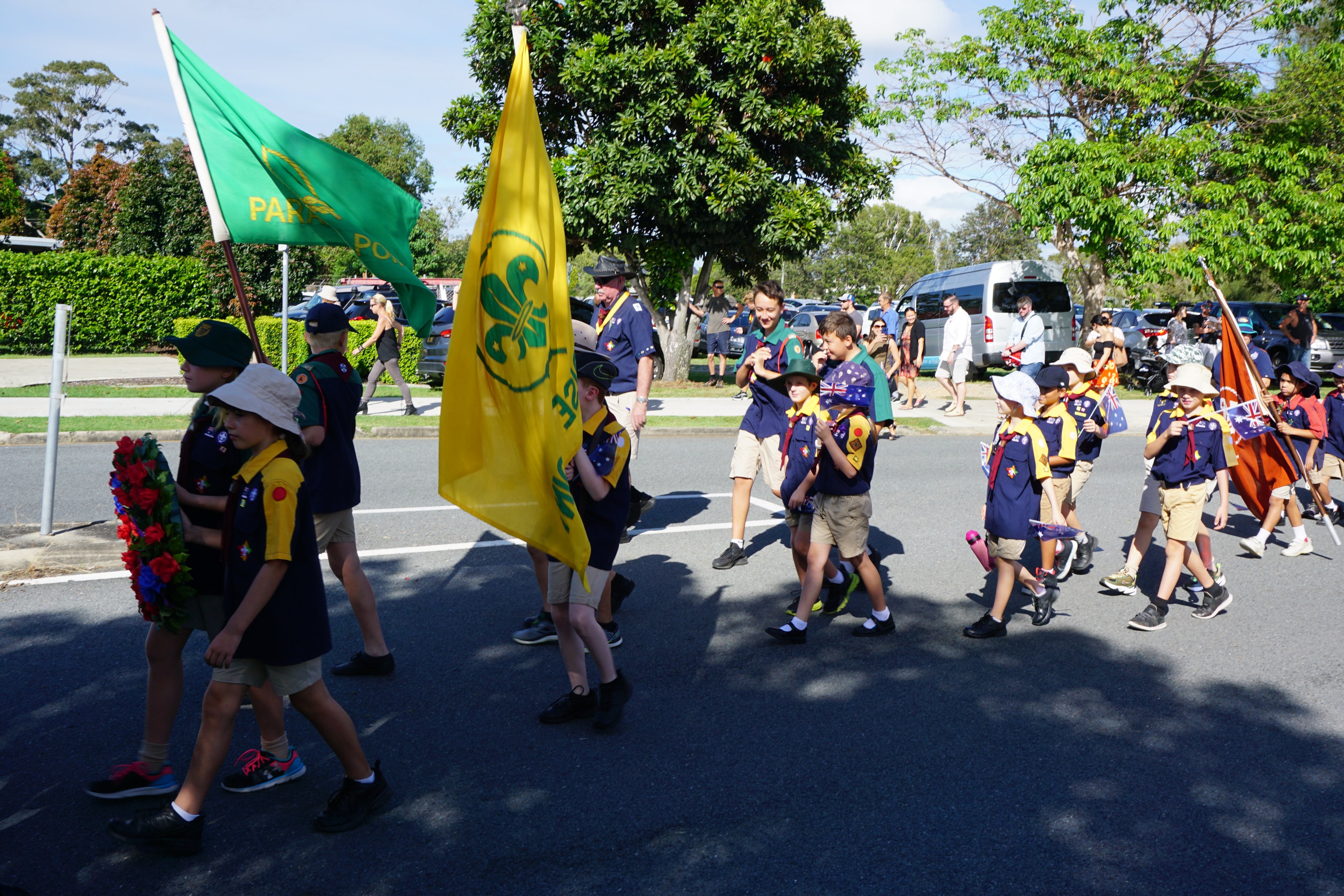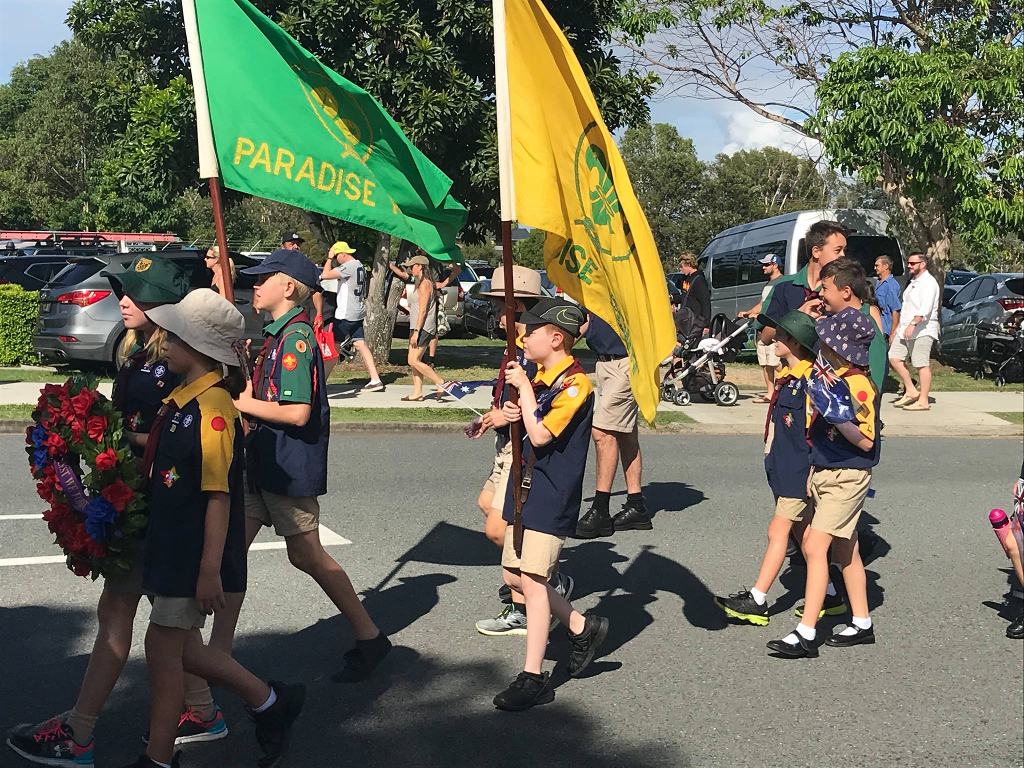 At 9:30am the parade started, with a number of Cadets, veterans, schools and different Scout and Guide groups taking part amongst others. Here are the Paradise Point Scouts and Cubs: