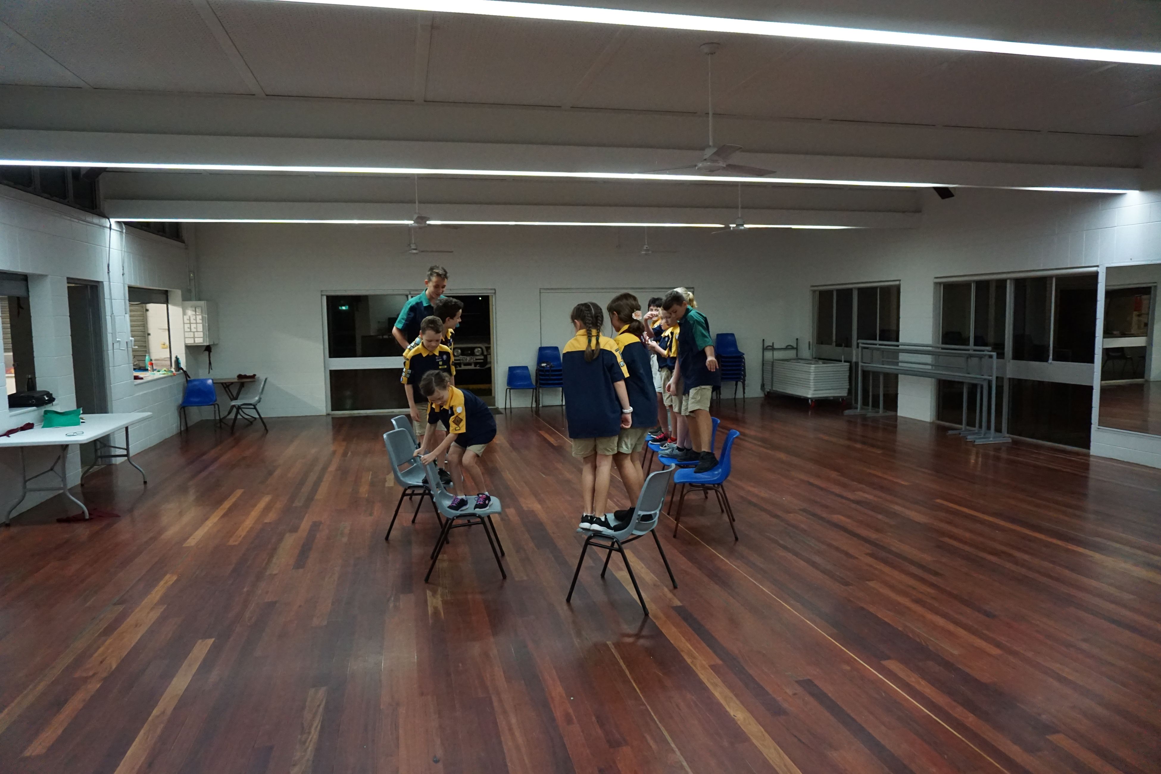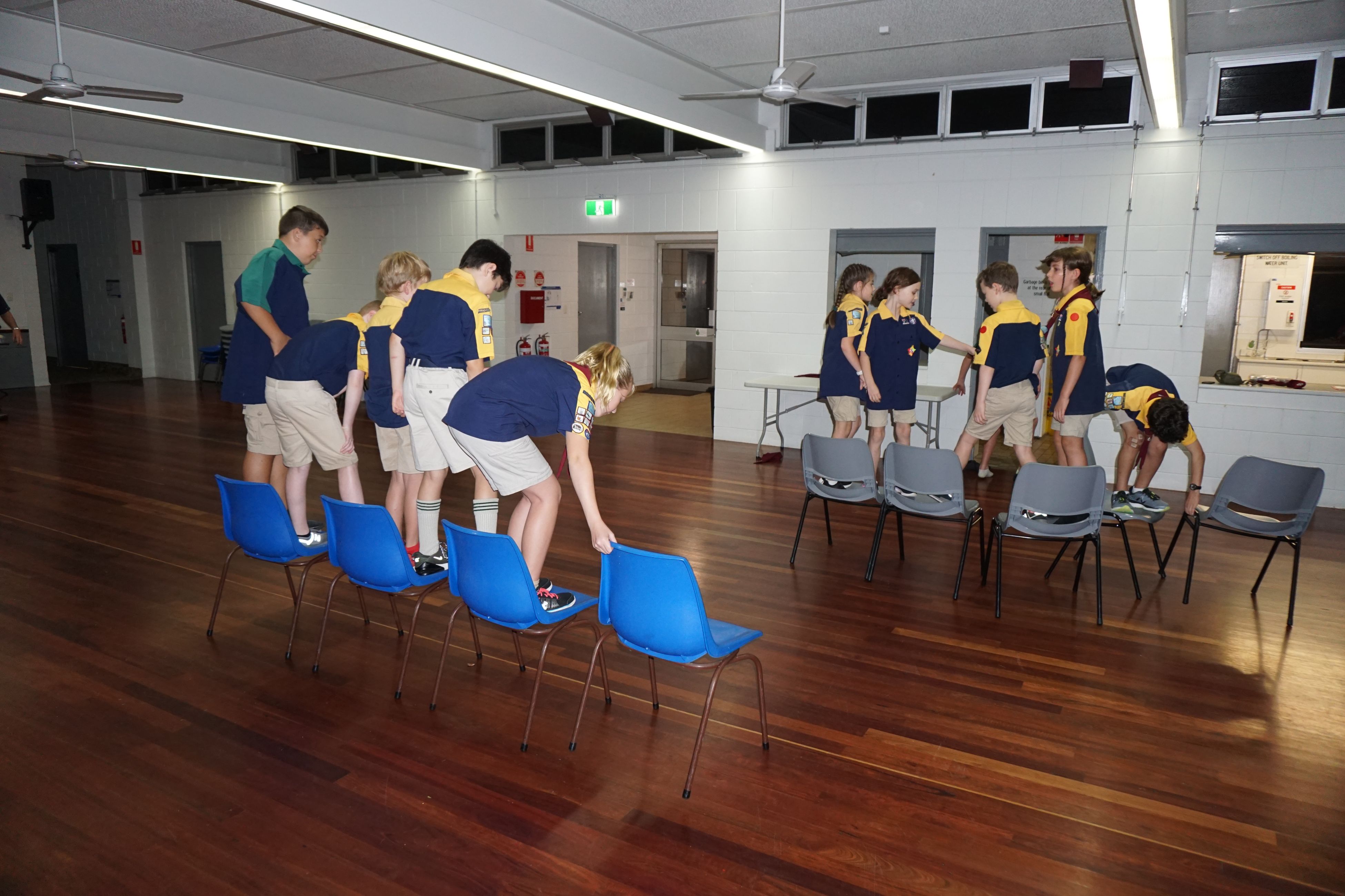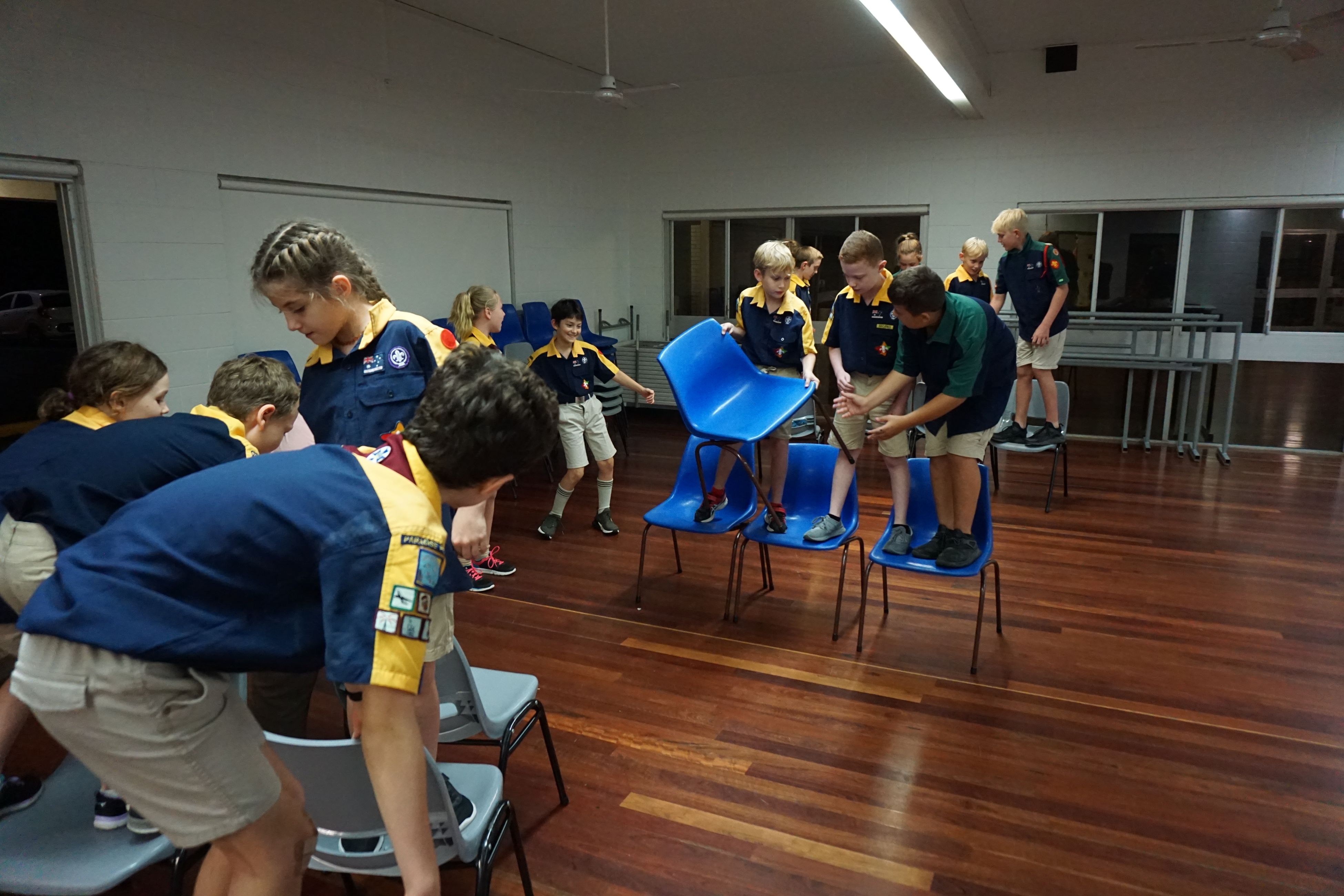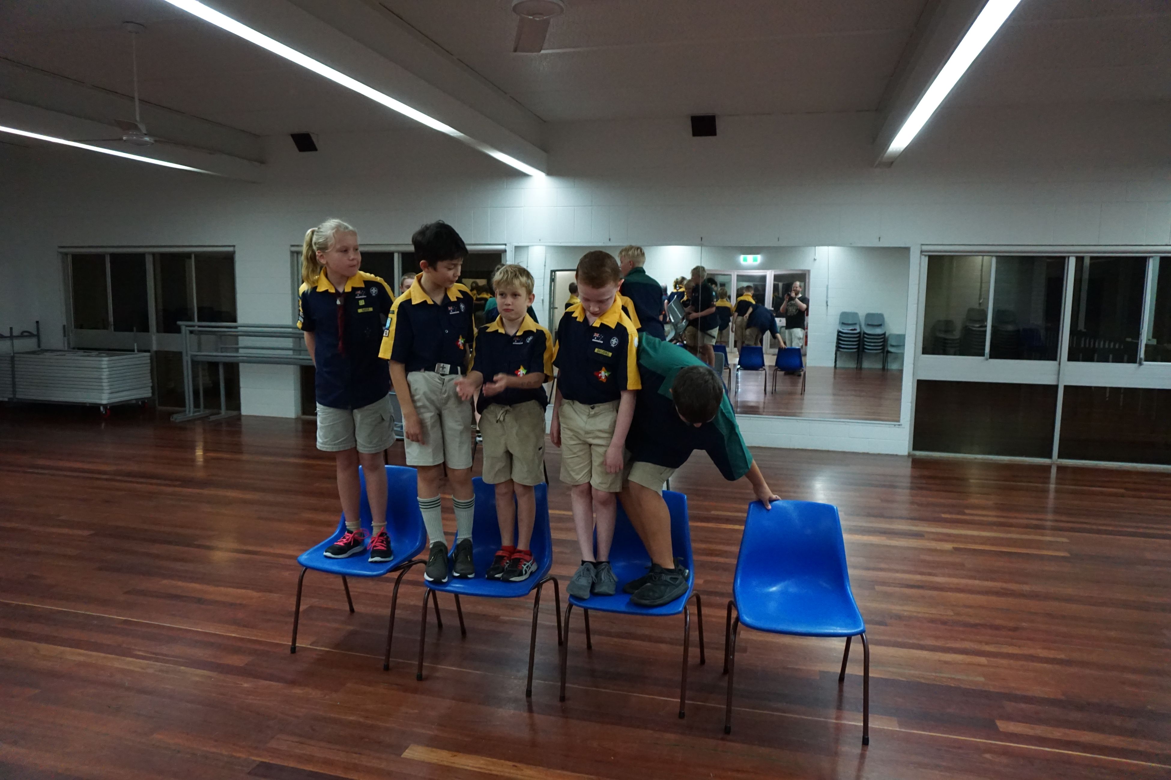 We ran a combined night with the Cubs Scouts and Scouts, so for the first game of Lava everyone was split up in to 3 teams and had to make their way over to the other side of the hall using chairs. Each team had 1 less chair than they had members and a maximum of two people were allowed on a chair. Things started well, but soon descended in to chaos, especially as two teams slowly edged closer to each other.