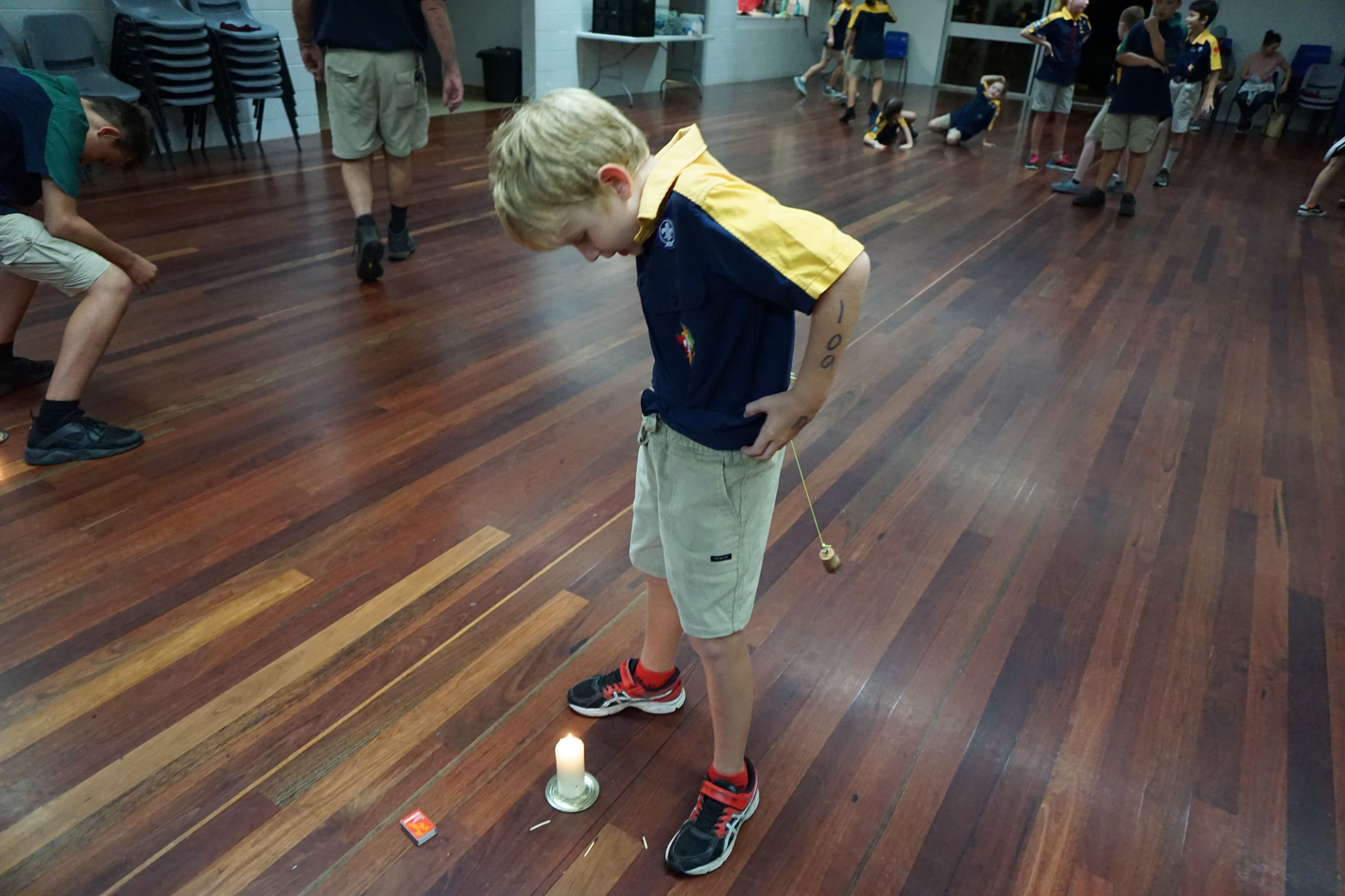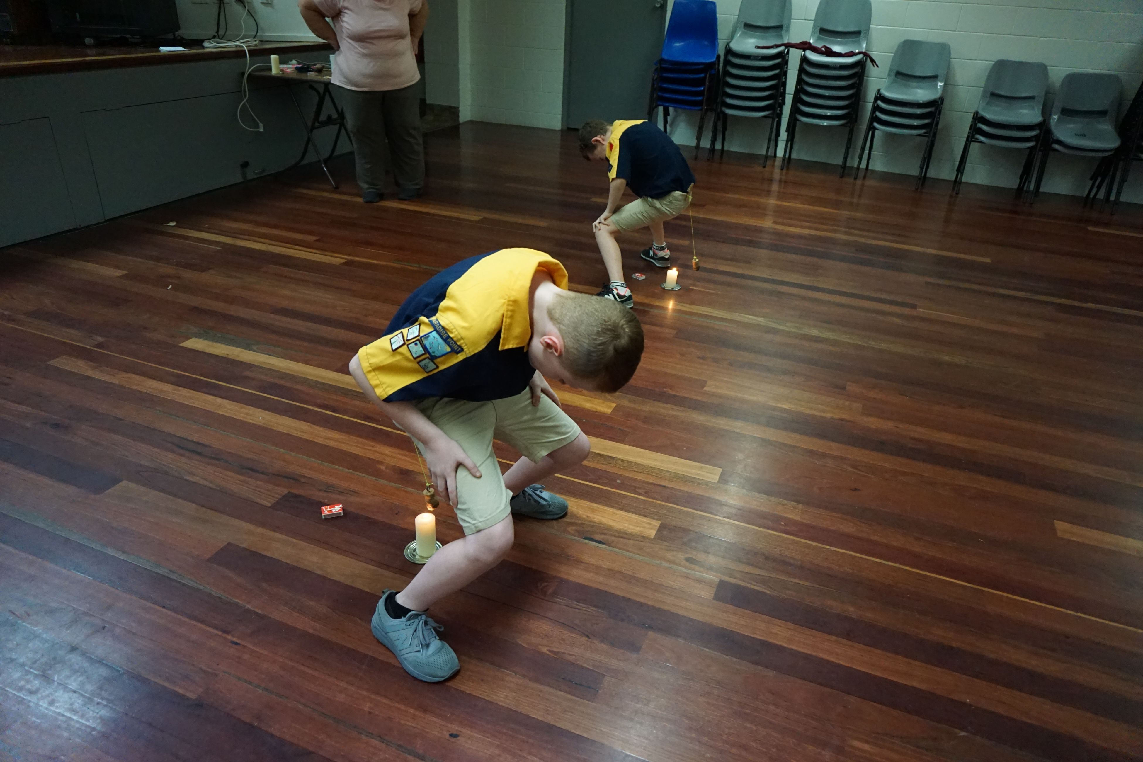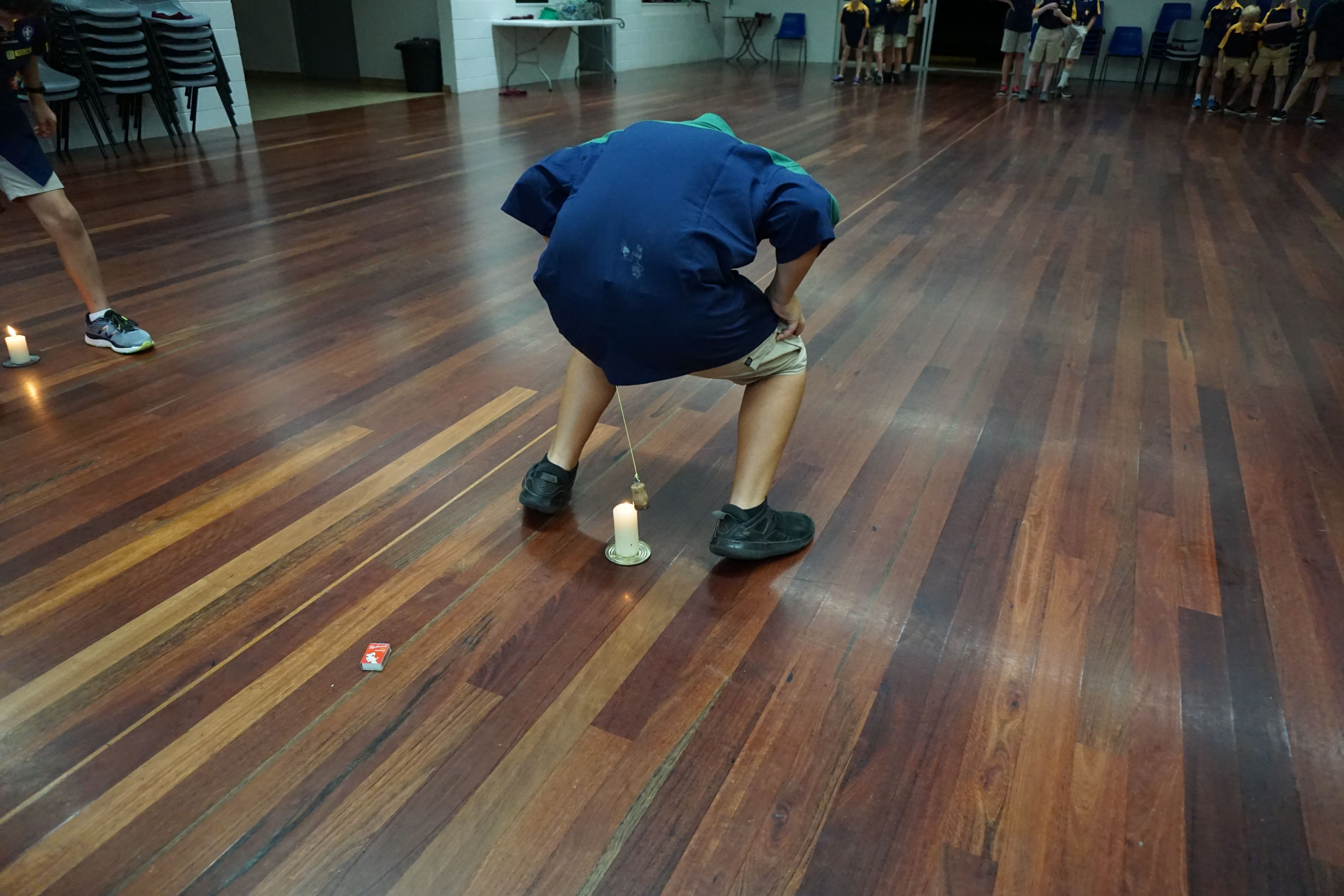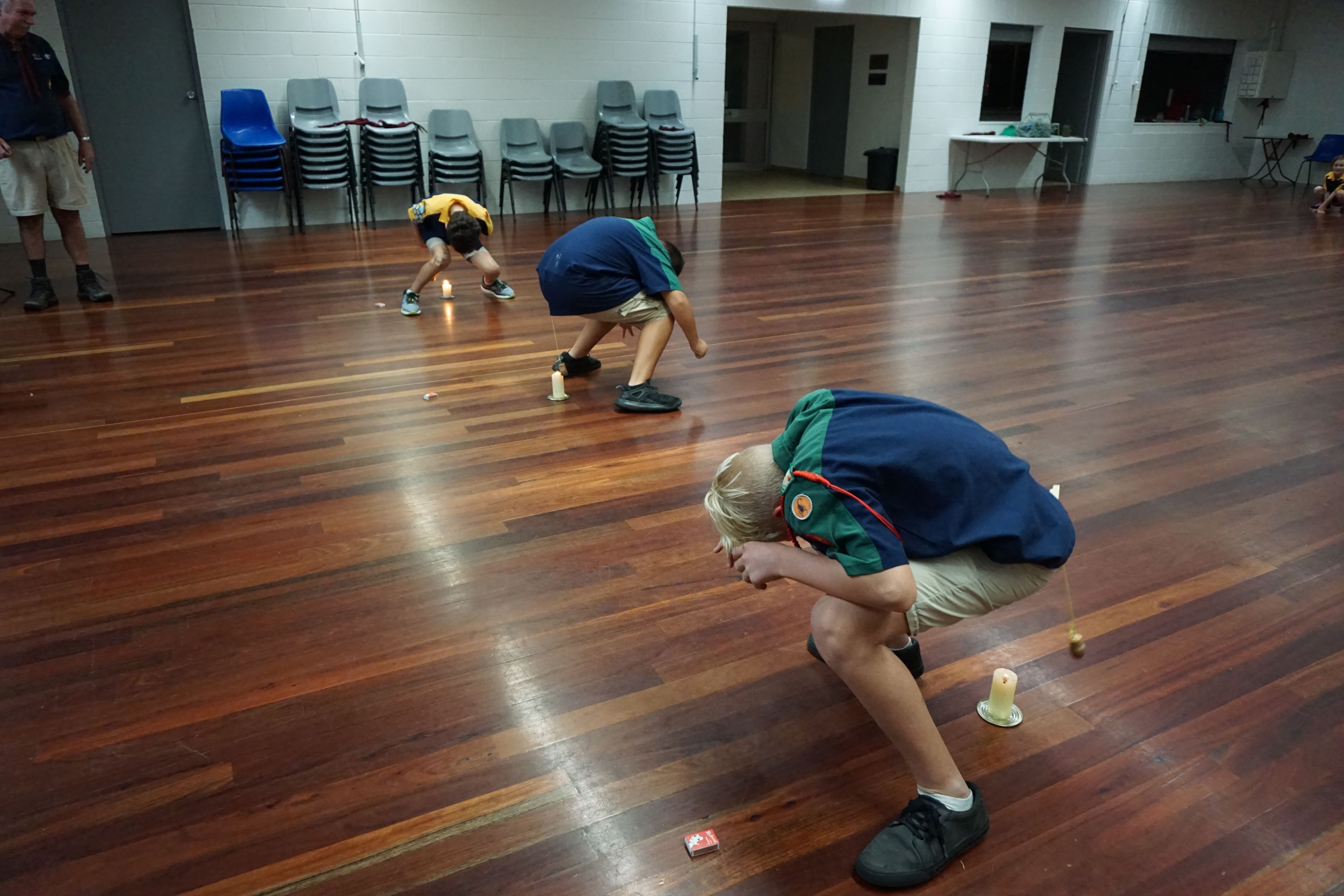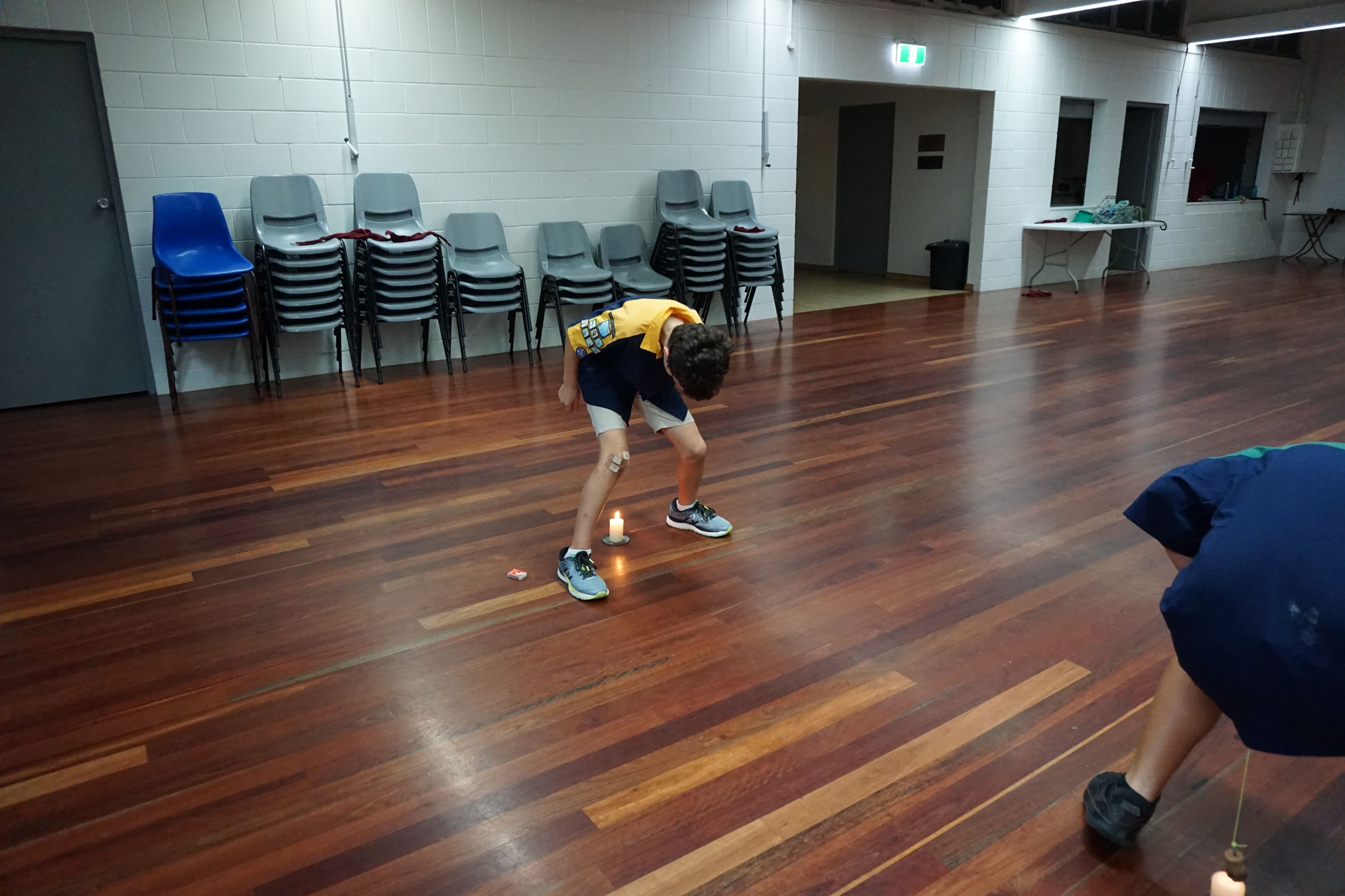 The last game of the night, and indeed the term, was the Candle Game. Everyone was split up in to the 3 groups used in the first game and given a cork attached to some string and a peg. They had to attach the peg of the back of their shorts and run to the other end of the hall. Once there they needed to put out a candle using the cork on the string, without using their hands. Once extinguished they had to relight the candle and run back to the next player. An adult was on hand at each candle to explain the safe use of matches where needed.