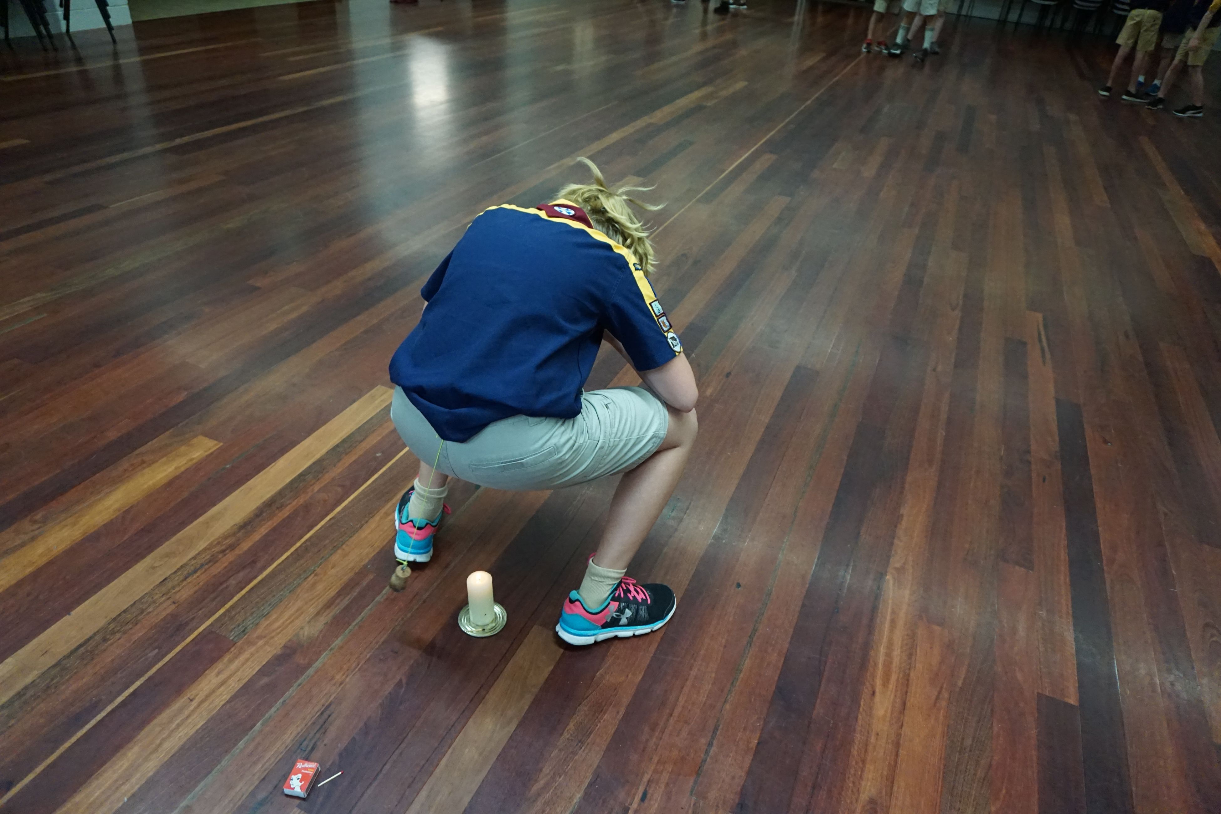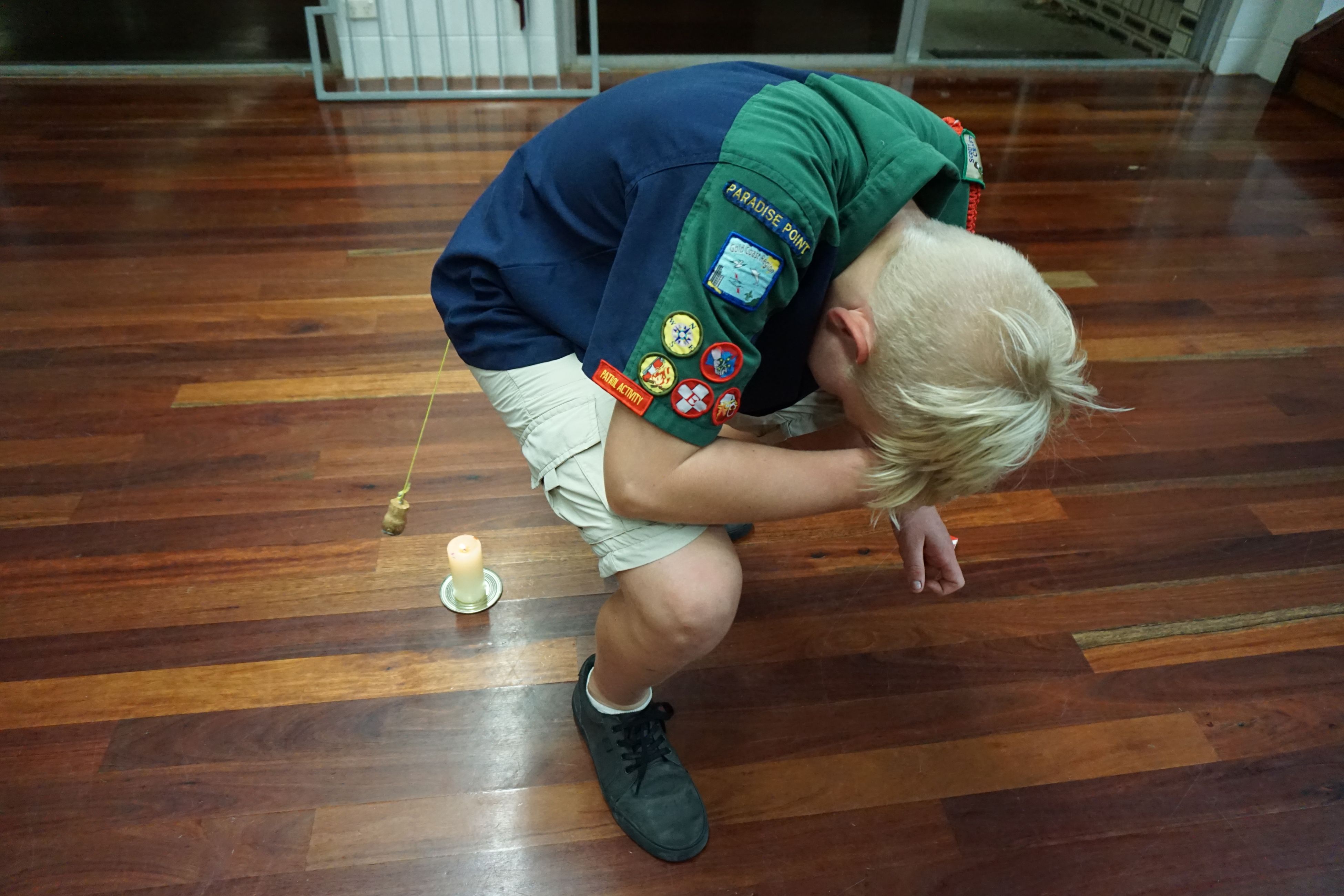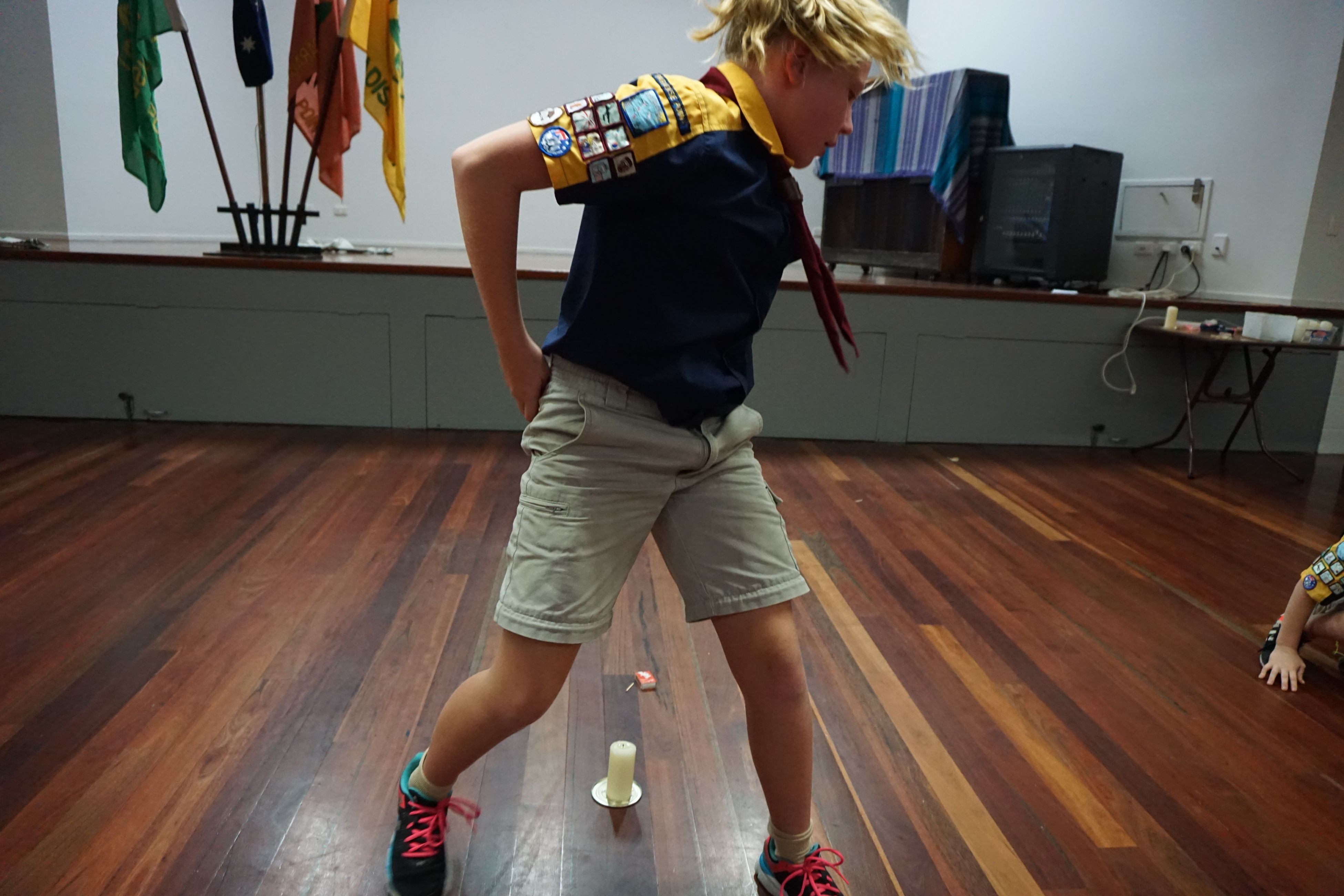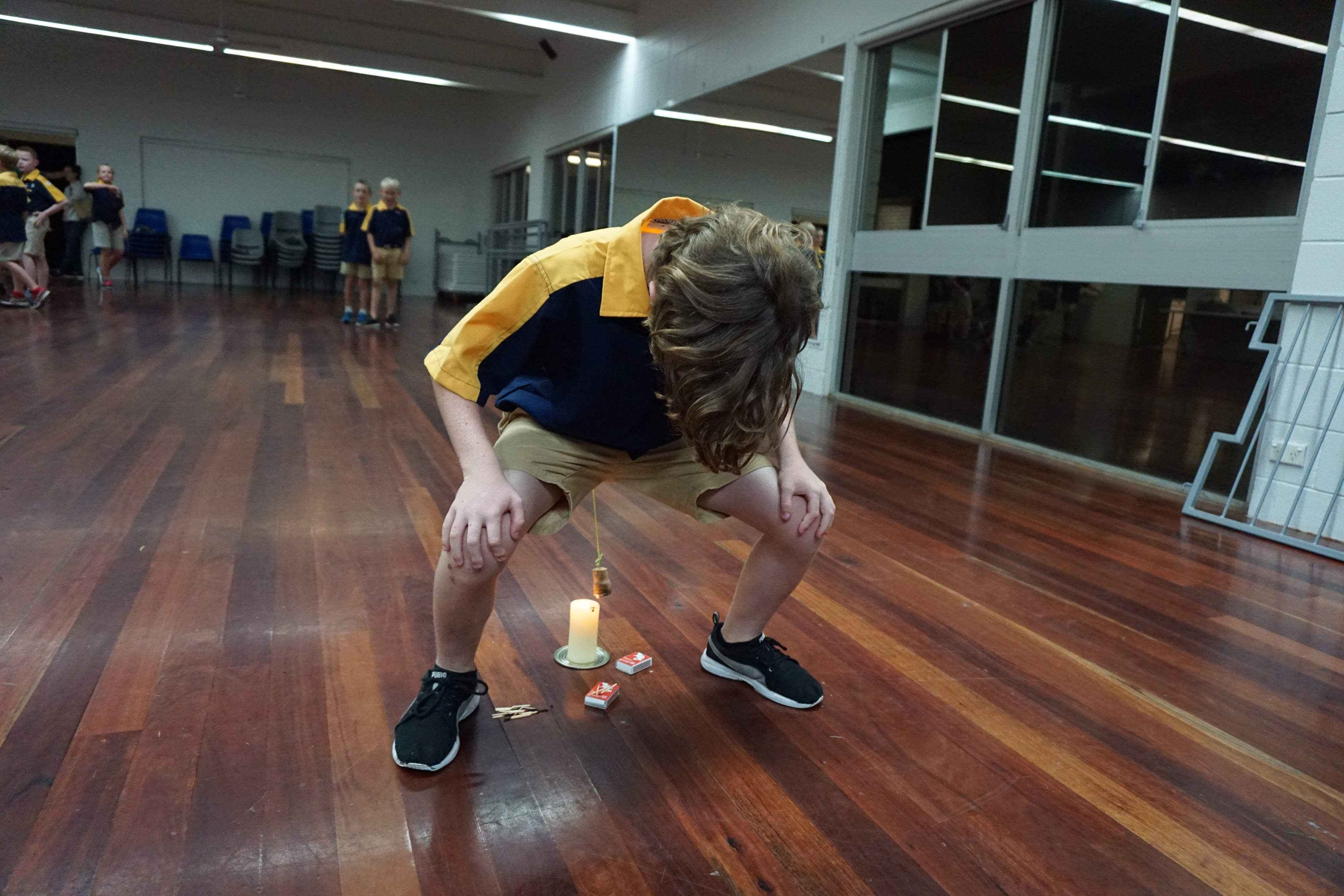 The last game of the night, and indeed the term, was the Candle Game. Everyone was split up in to the 3 groups used in the first game and given a cork attached to some string and a peg. They had to attach the peg of the back of their shorts and run to the other end of the hall. Once there they needed to put out a candle using the cork on the string, without using their hands. Once extinguished they had to relight the candle and run back to the next player. An adult was on hand at each candle to explain the safe use of matches where needed.