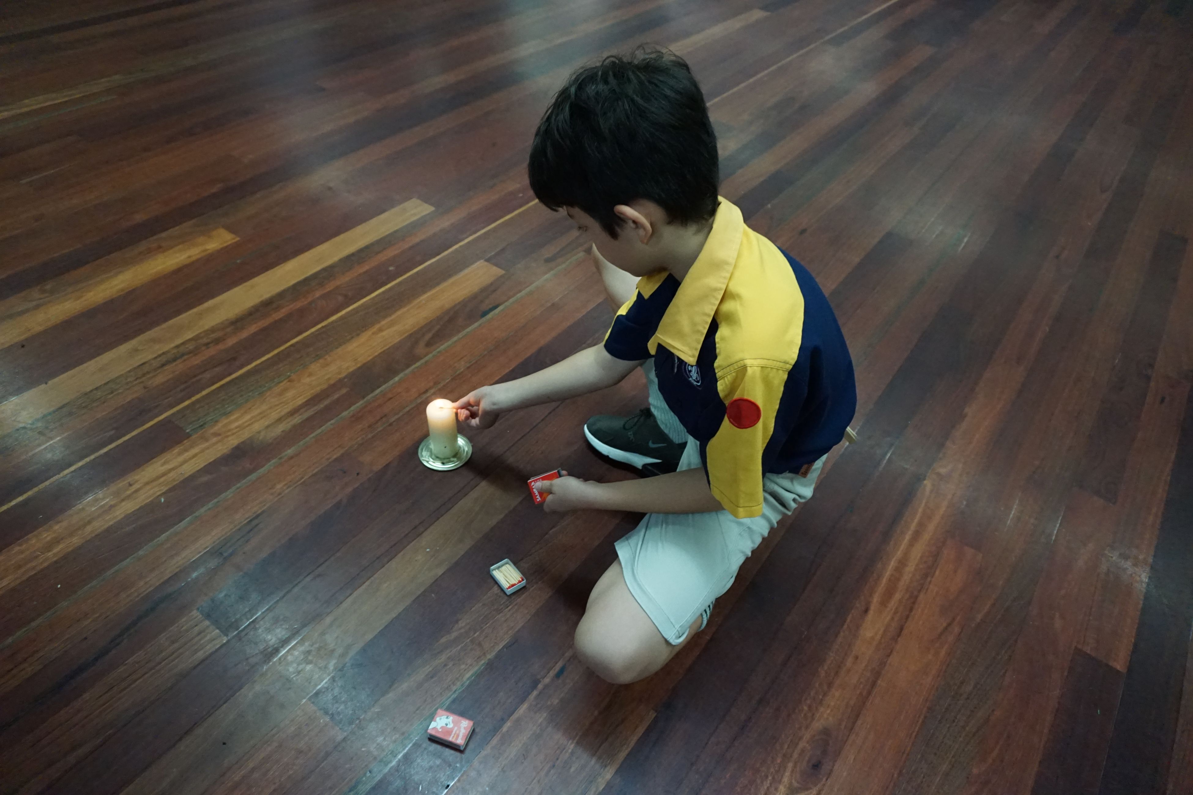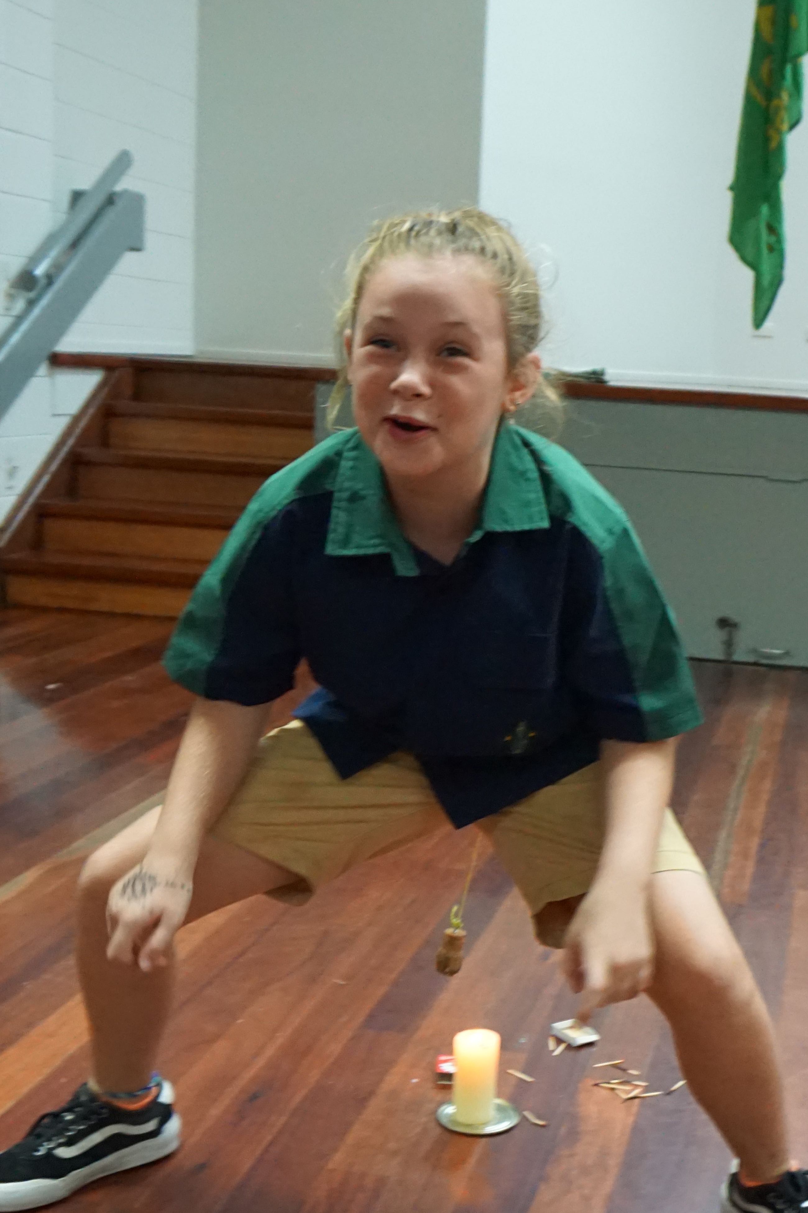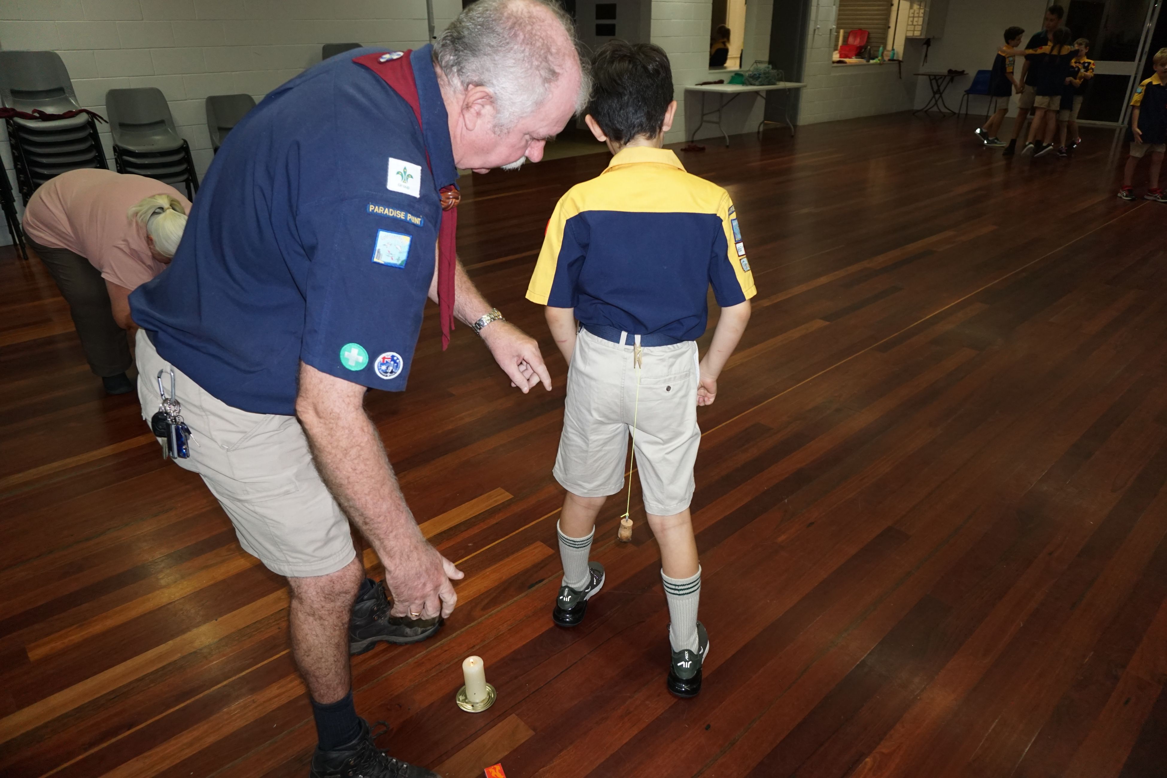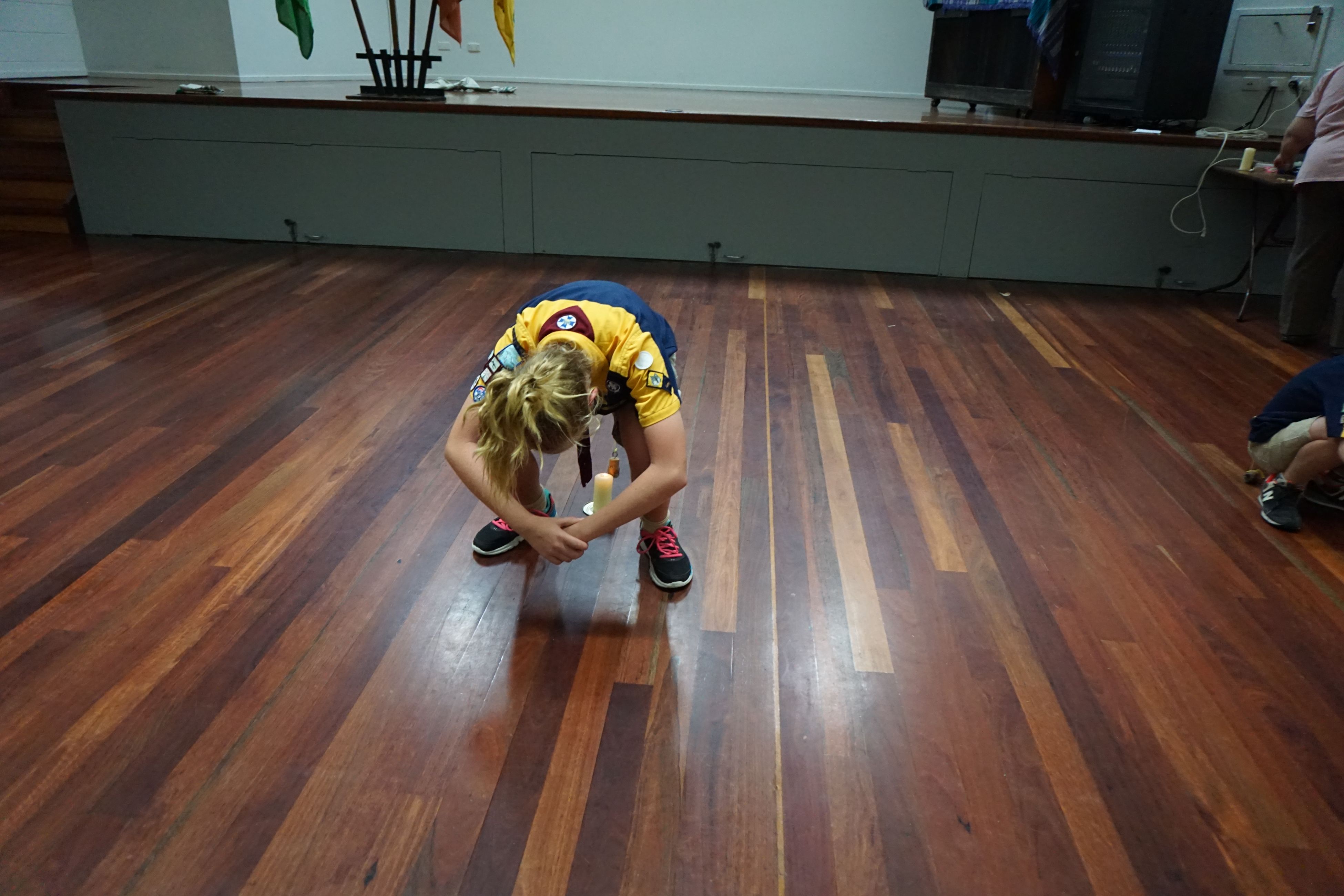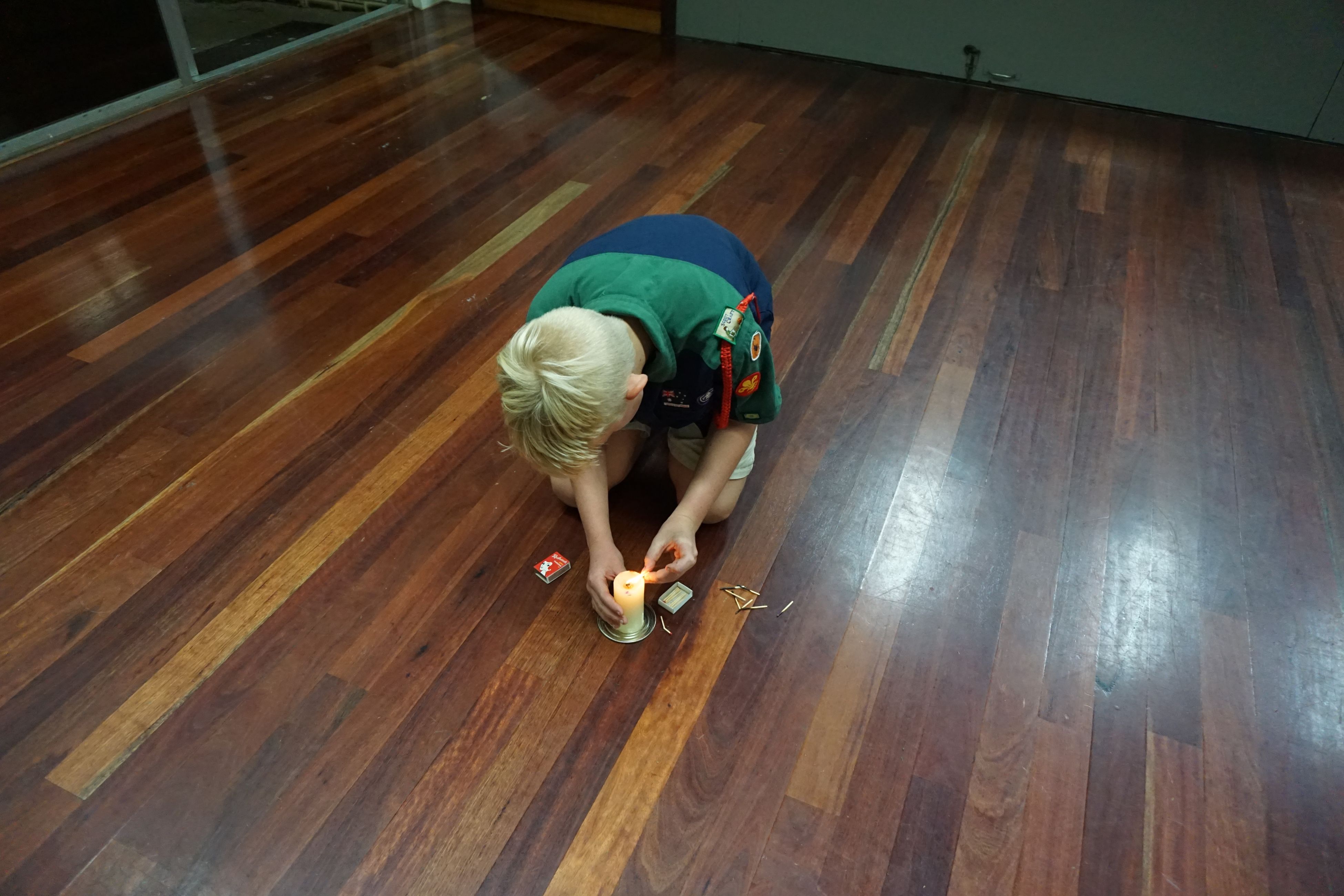 The last game of the night, and indeed the term, was the Candle Game. Everyone was split up in to the 3 groups used in the first game and given a cork attached to some string and a peg. They had to attach the peg of the back of their shorts and run to the other end of the hall. Once there they needed to put out a candle using the cork on the string, without using their hands. Once extinguished they had to relight the candle and run back to the next player. An adult was on hand at each candle to explain the safe use of matches where needed.