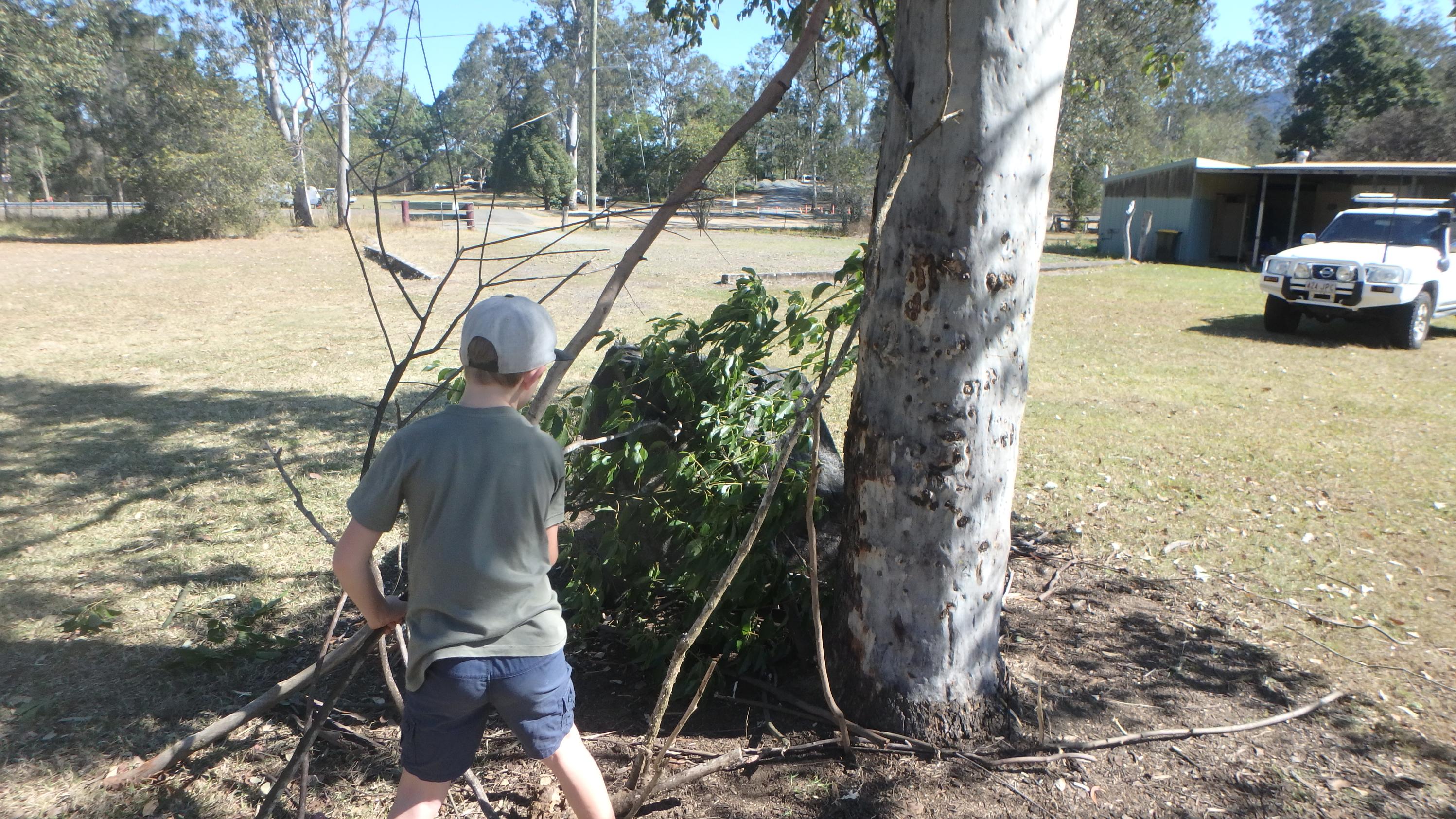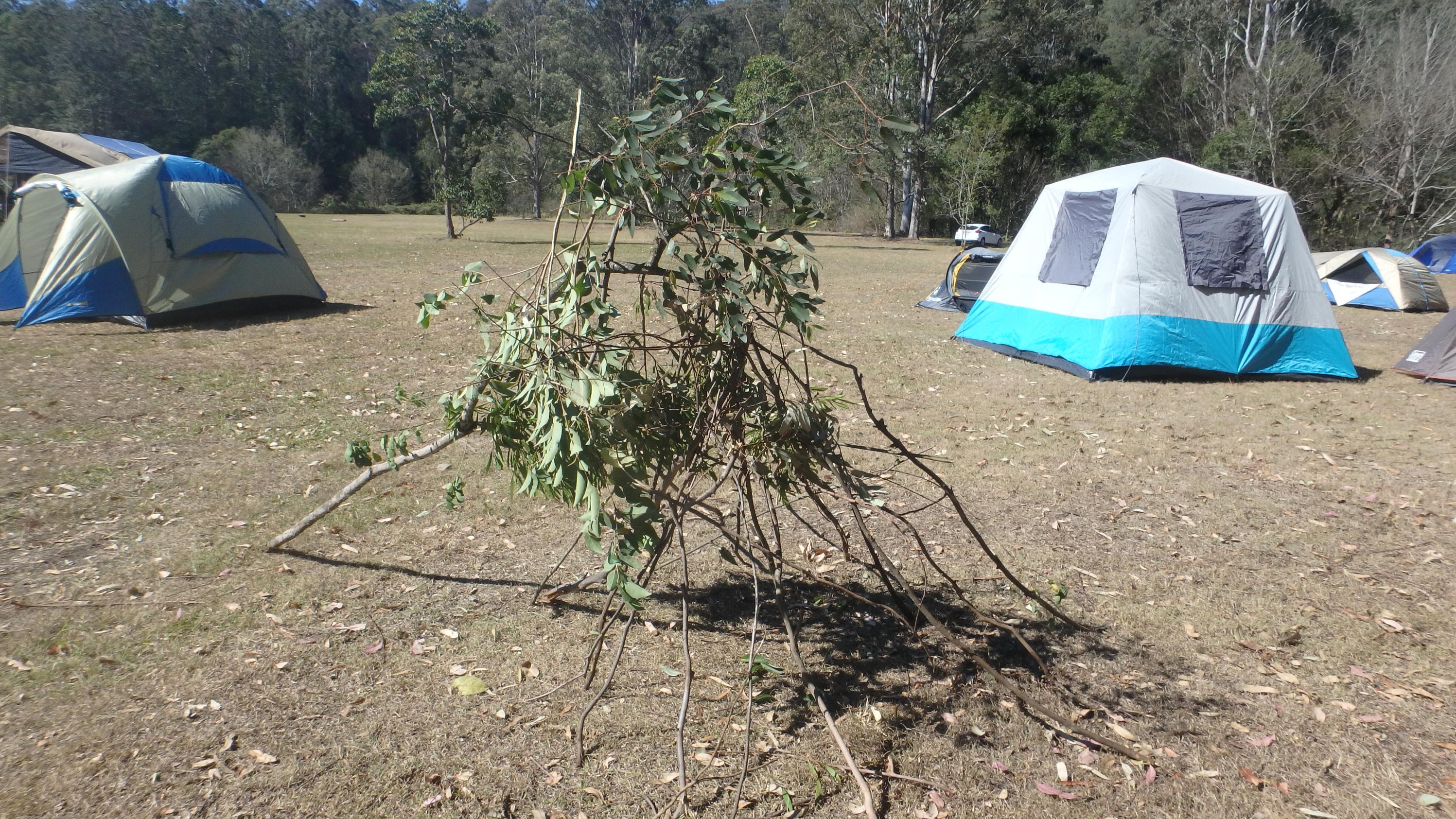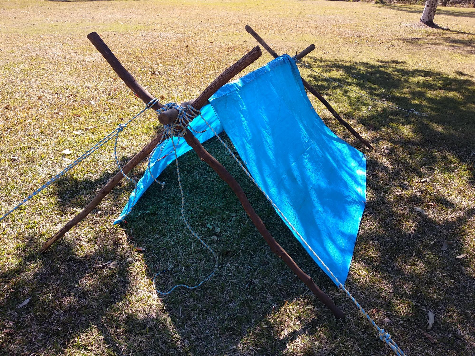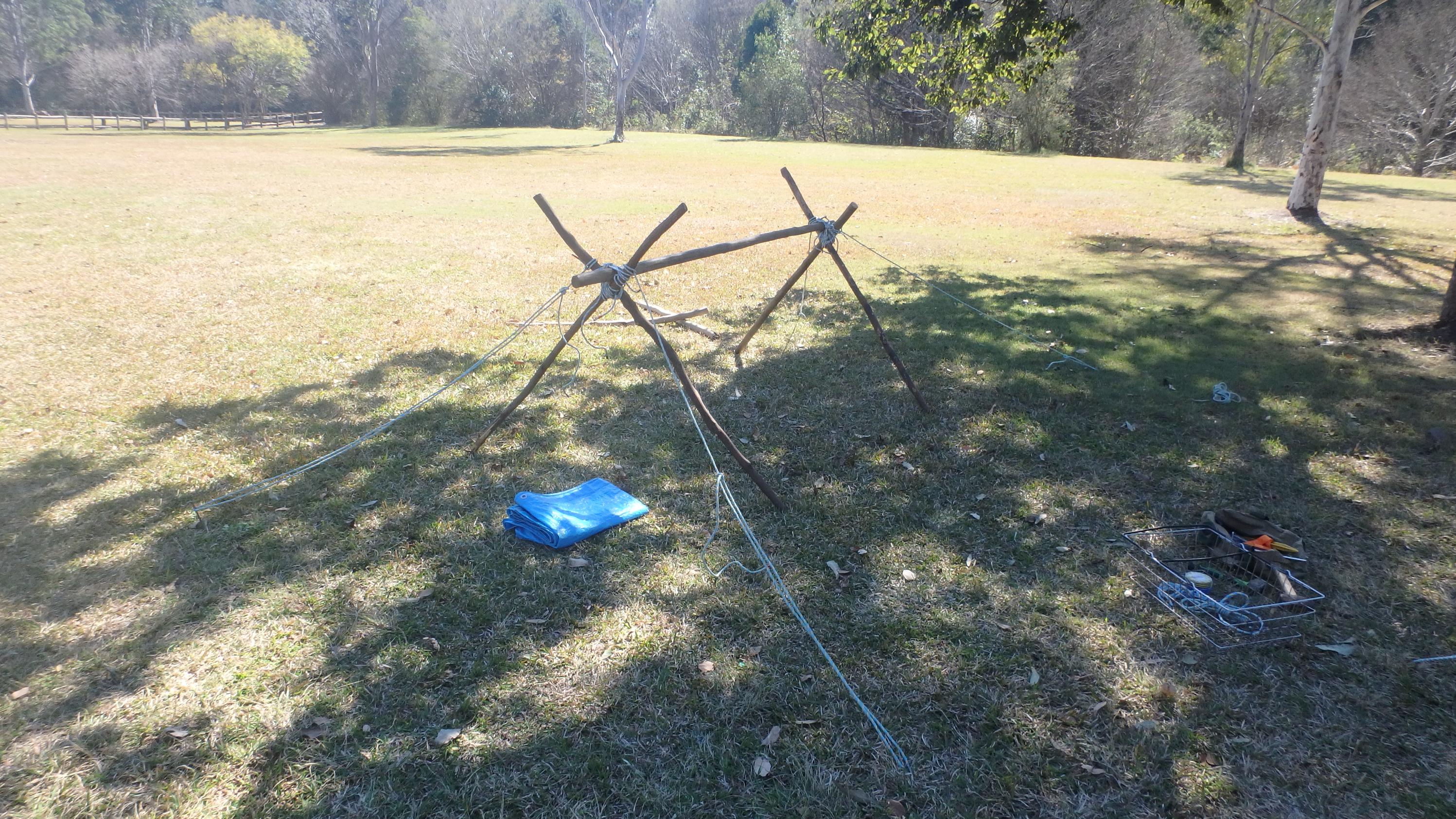 After lunch everyone helped to clean up and then whilst the Scouts completed their earlier camp gadget and shelter the Cub Scouts were asked to have a go at putting together shelters from what they could find laying about in the field: