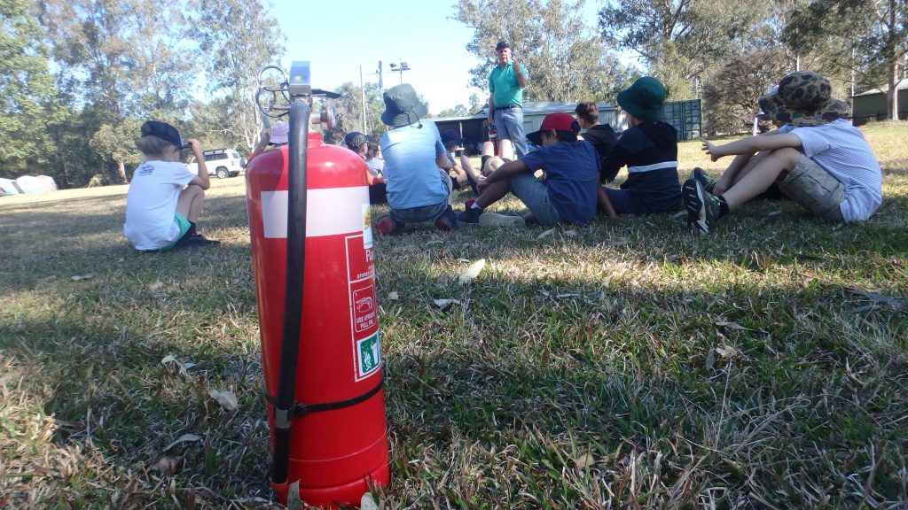 Back together as a group we went over how to extinguish fires with the Cub Scouts and everyone had a go using some fire extinguishers which had been donated to the group. We also had a look at how to start fires without matches using a battery and steel wool, magnifying glass and a flint and steel.