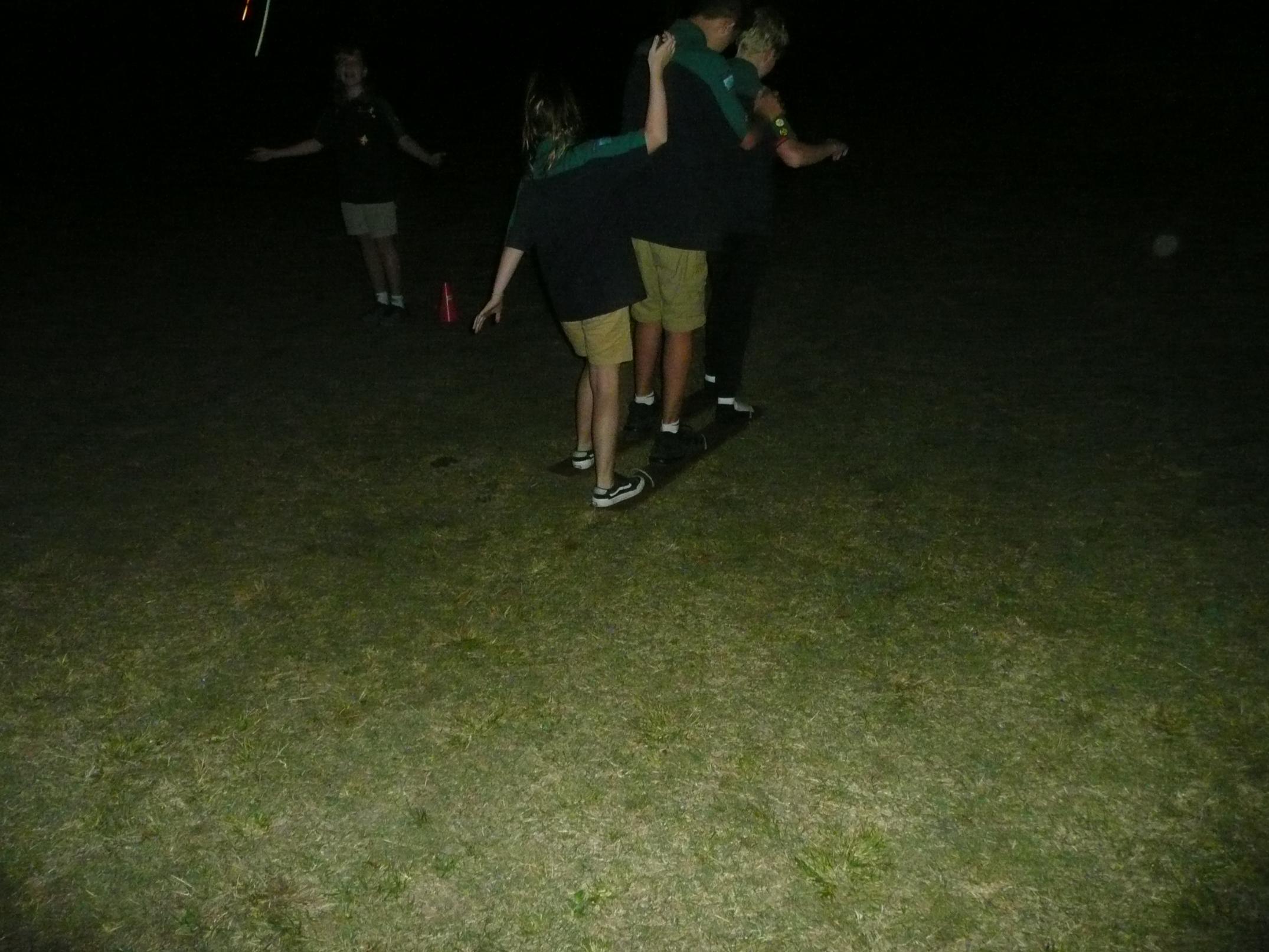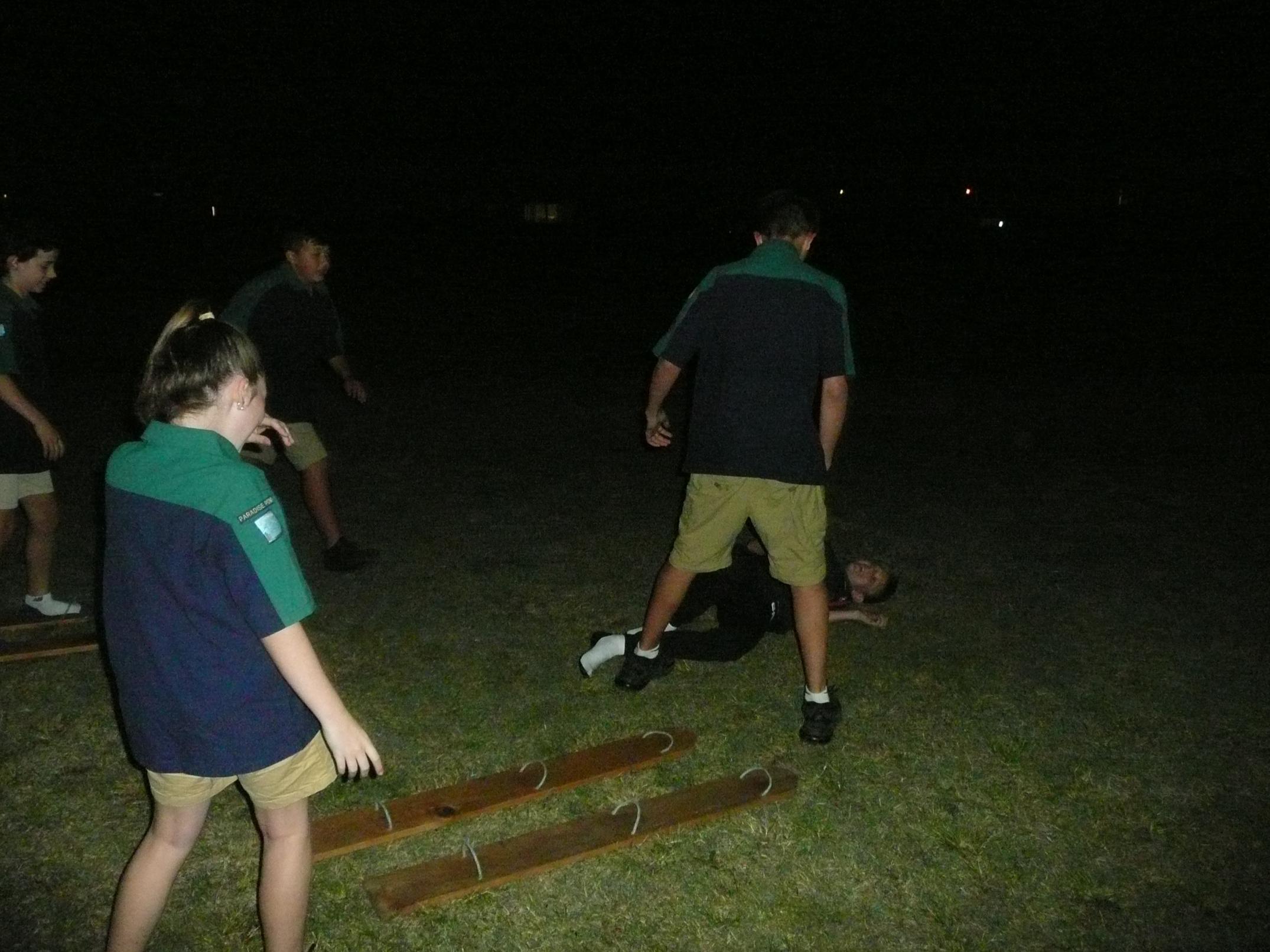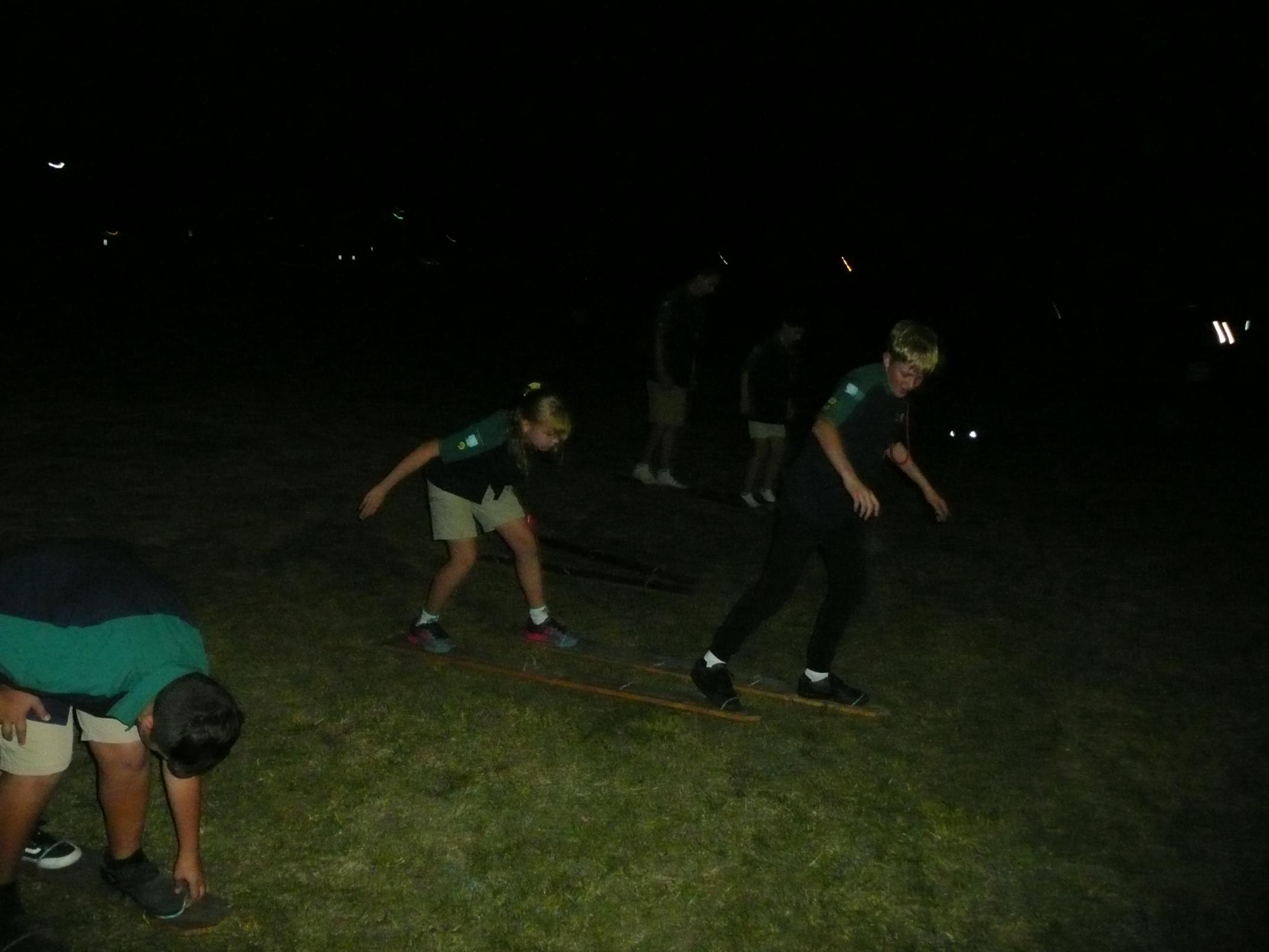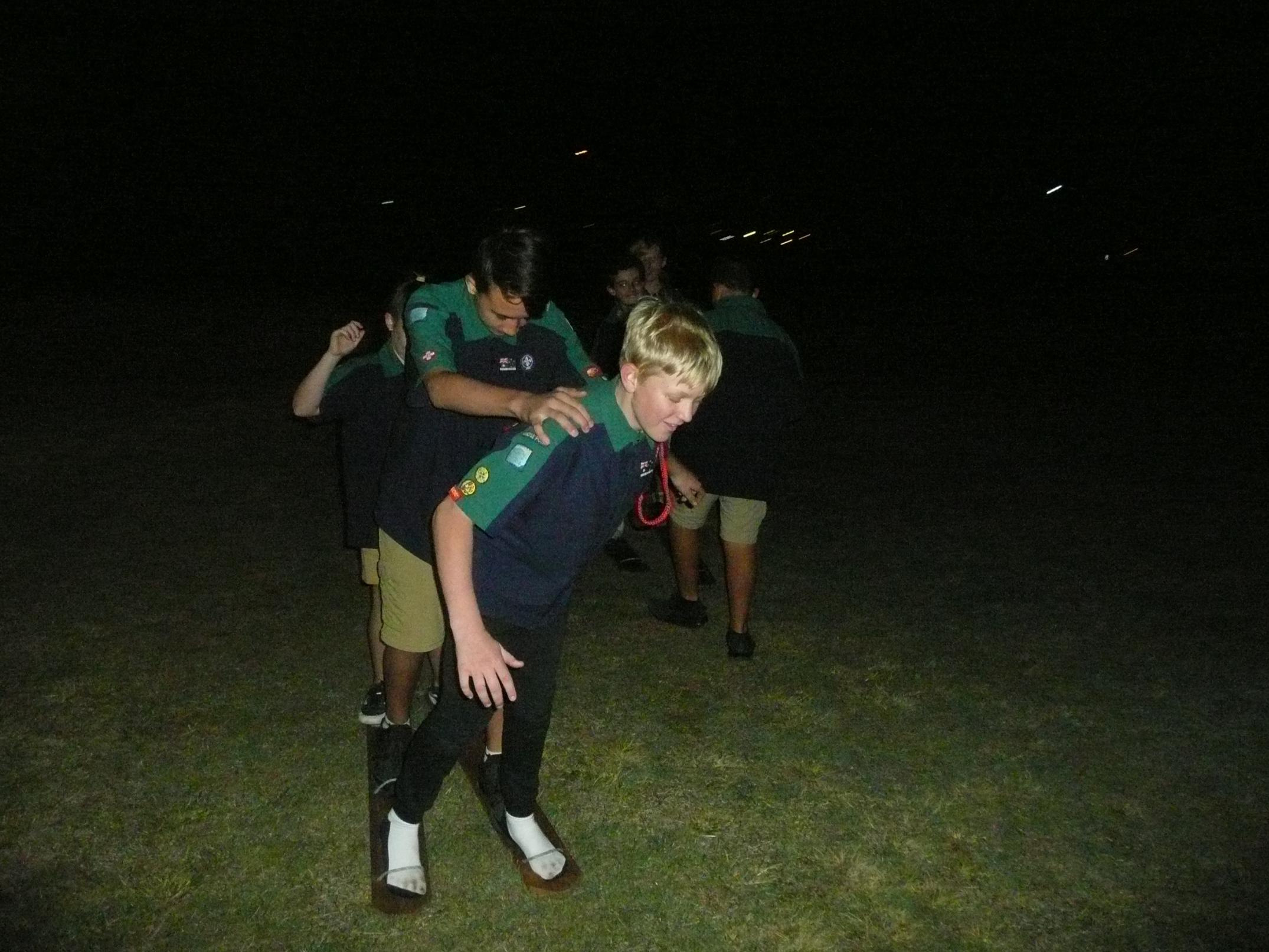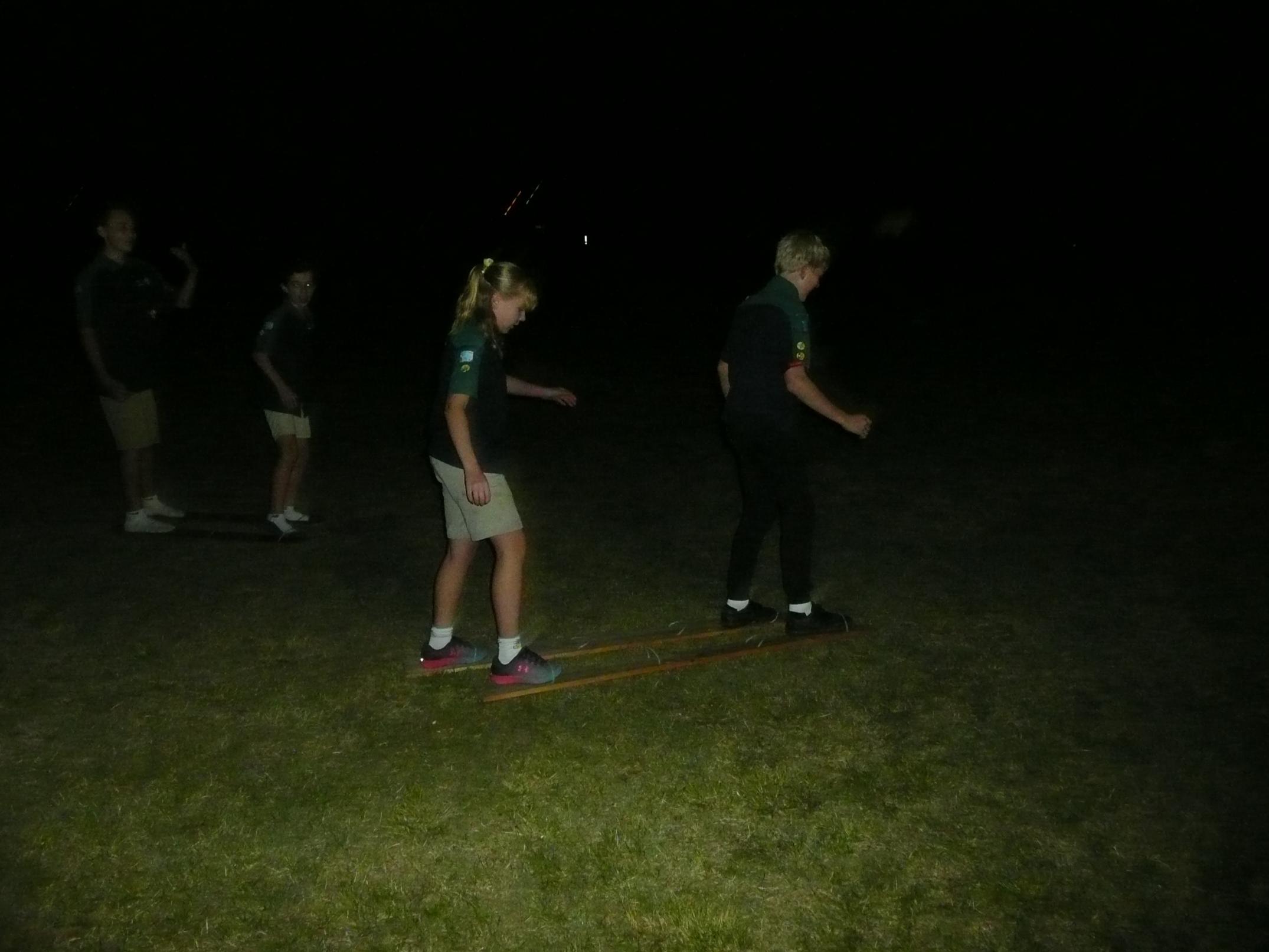 After a parade it was straight outside tonight, with a game of Team Skies. The Scouts were randomly assigned in to 2 groups of three and fitted with a pair of skis for each group. On go they had to race as a team to the end of a track, turn around and come back again. We repeated the game in pairs, which they all noticed was much easier to co-ordinate.