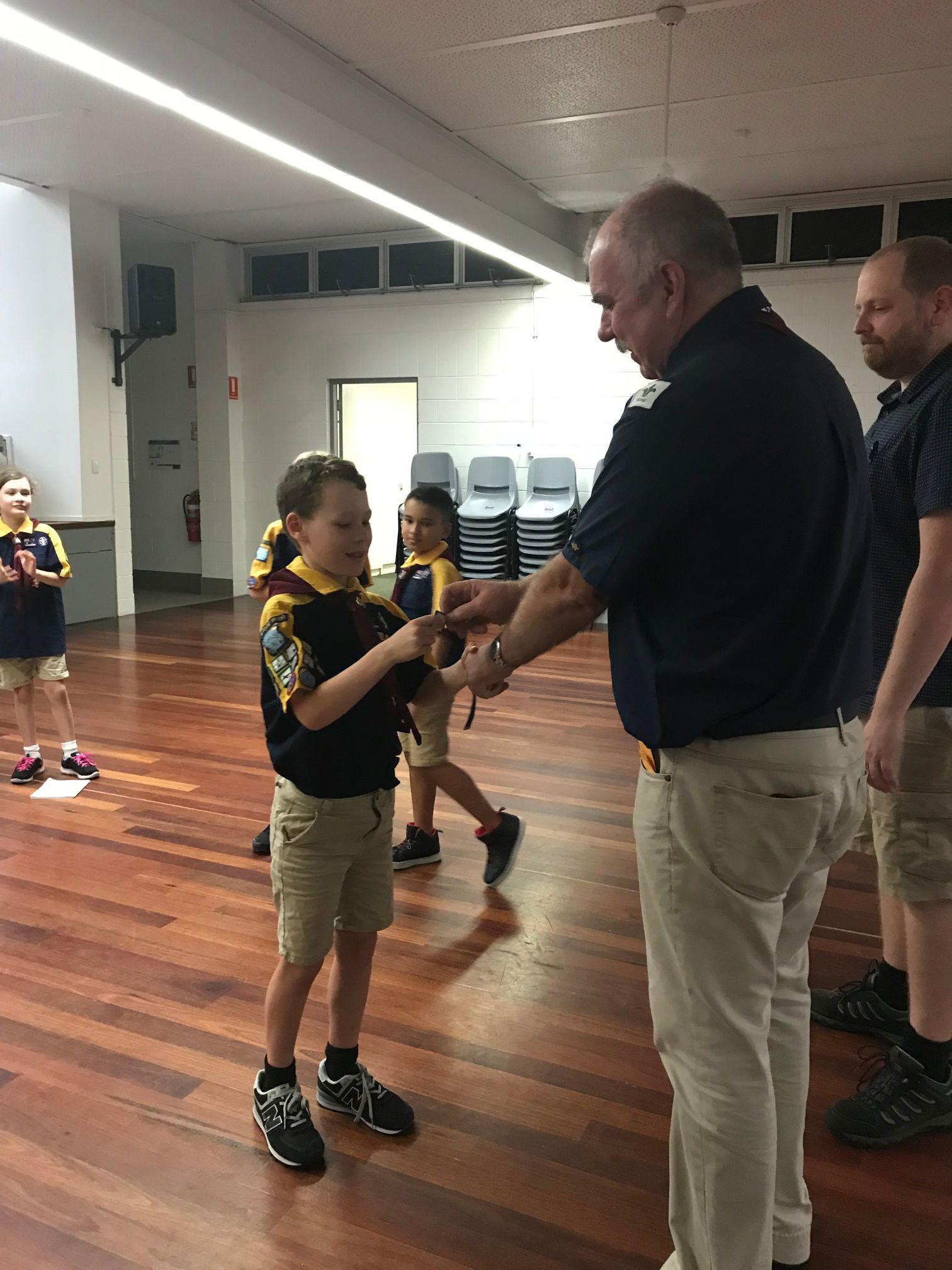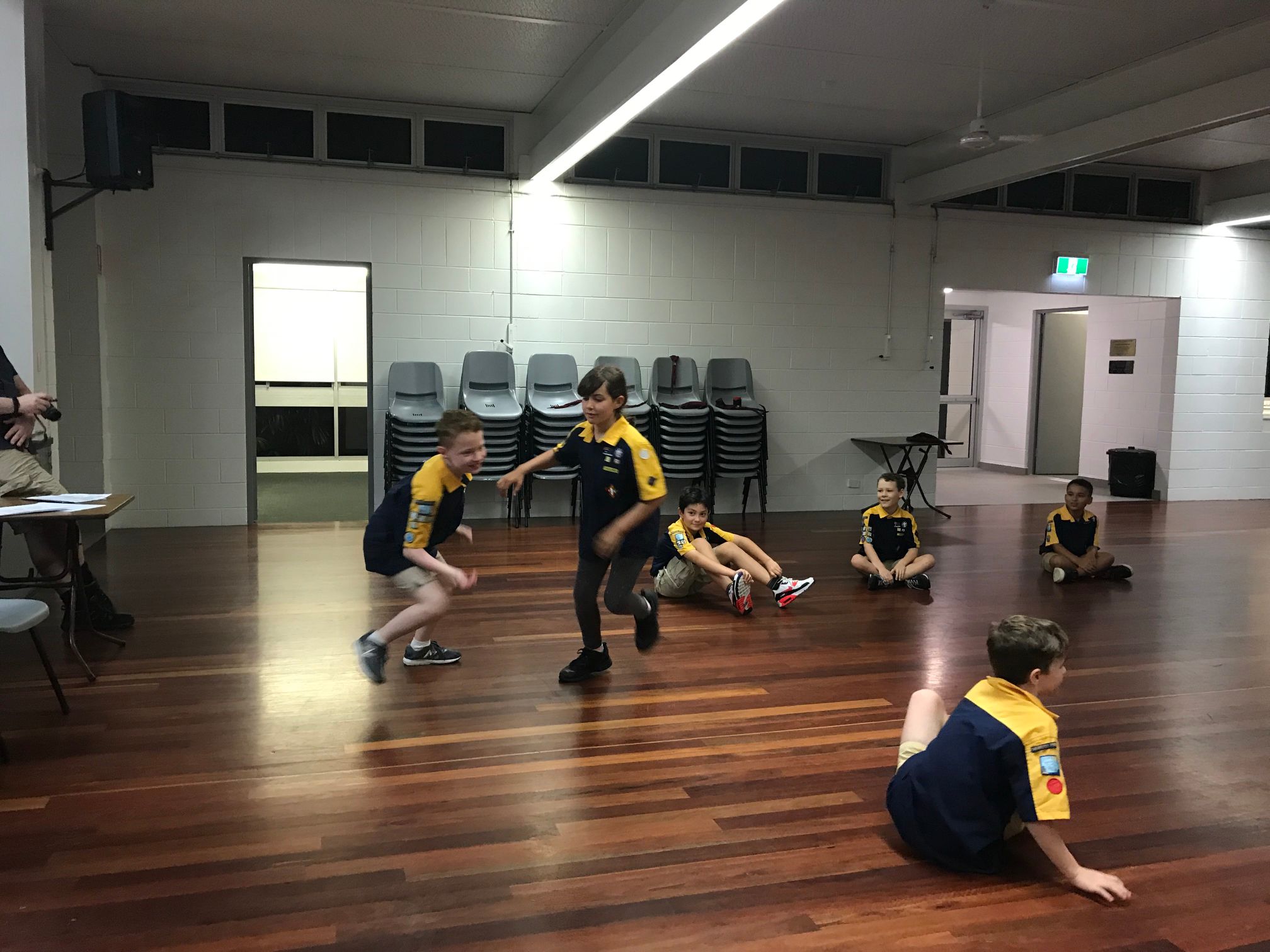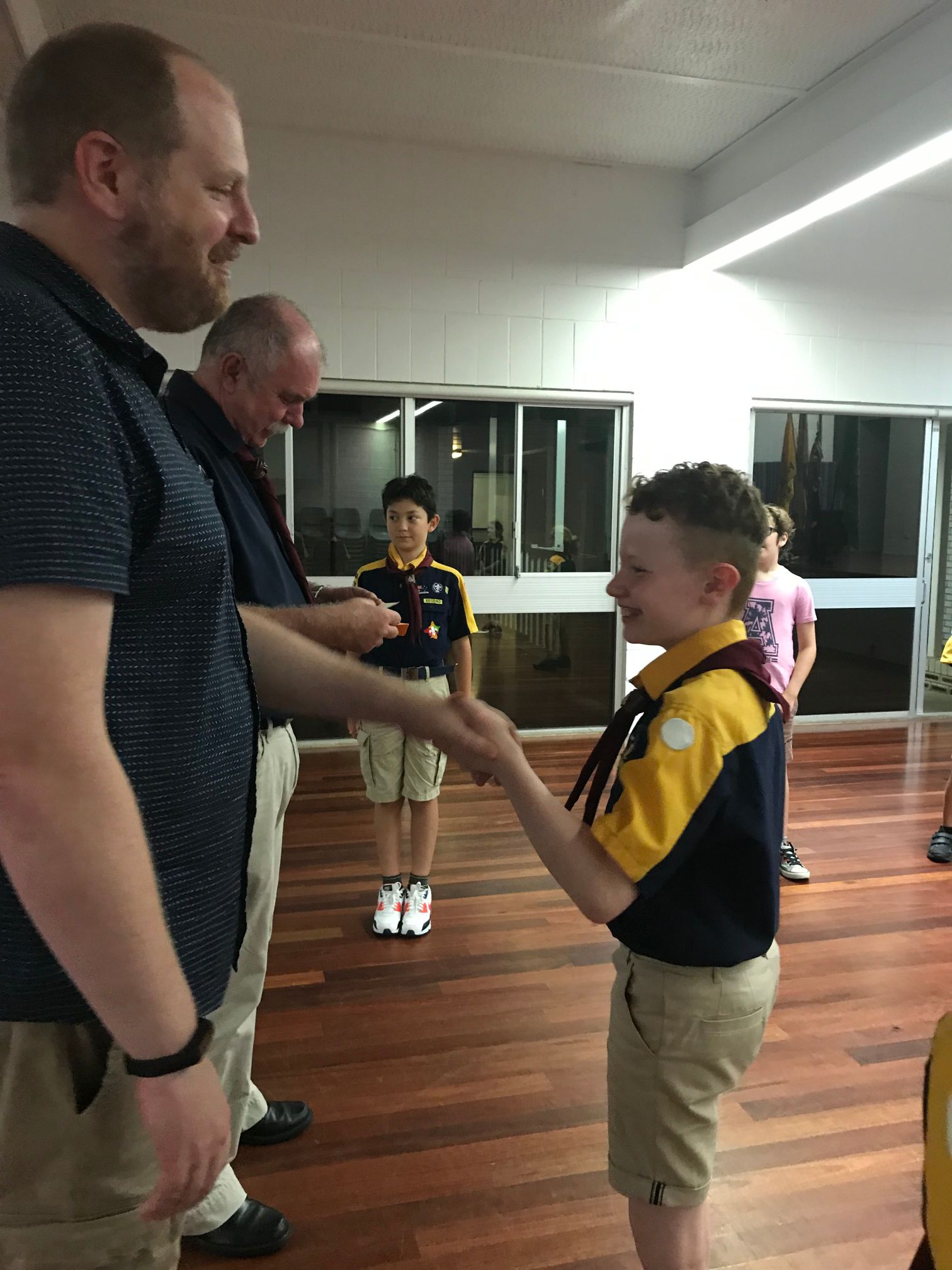 We then learnt the story about why Scouts shake with their left hands, and played Left Hand Tag. The Cub Scouts sat in a circle while the ‘it’ person walked around and picked somebody. That person then stood up and they shook hands, left of course. The ‘it’ cub then got to choose to run clockwise or anticlockwise, while the other Cub Scout had to run the other way, with a race to get back to the starting point and sit down. Last person back was now ‘it’.
