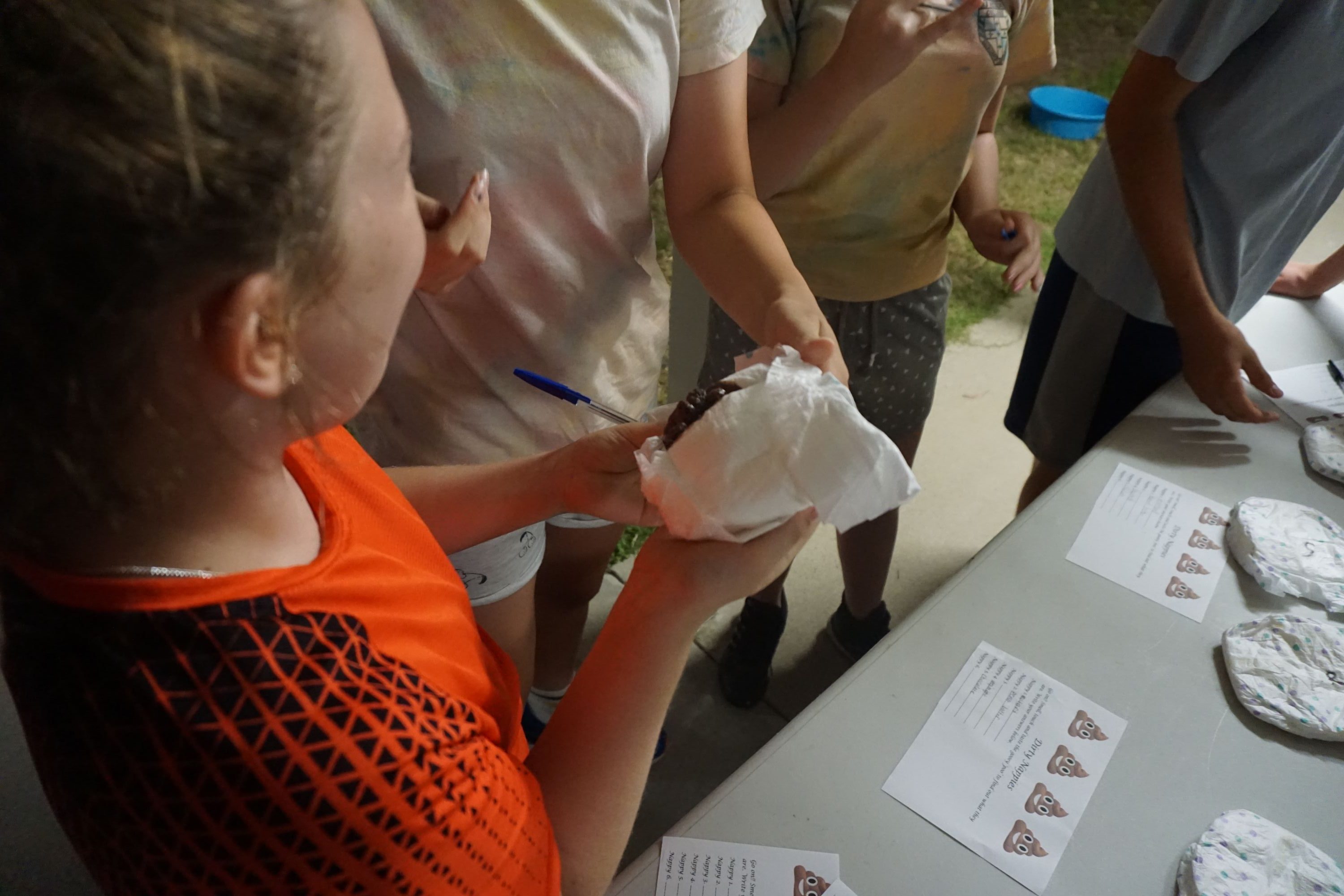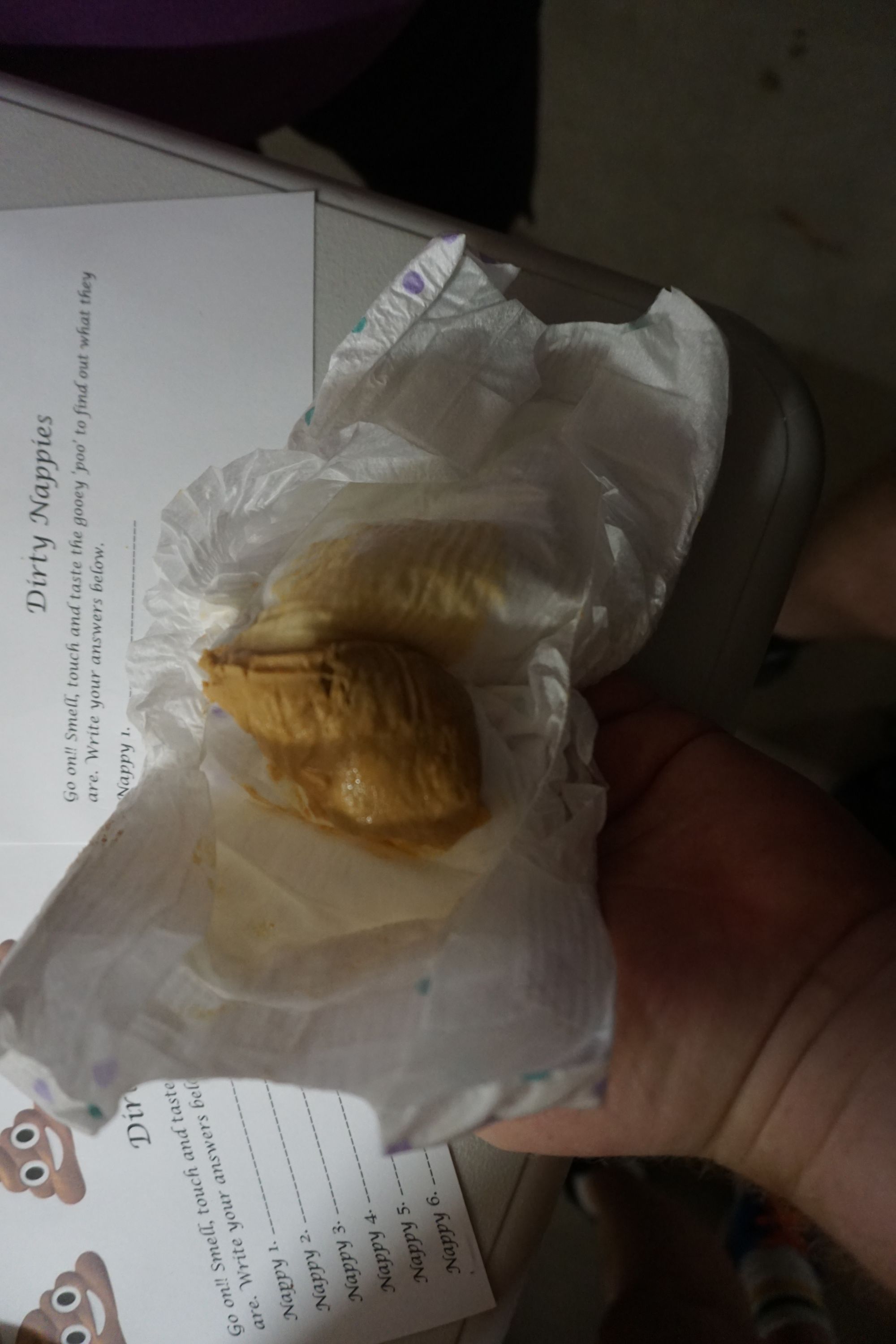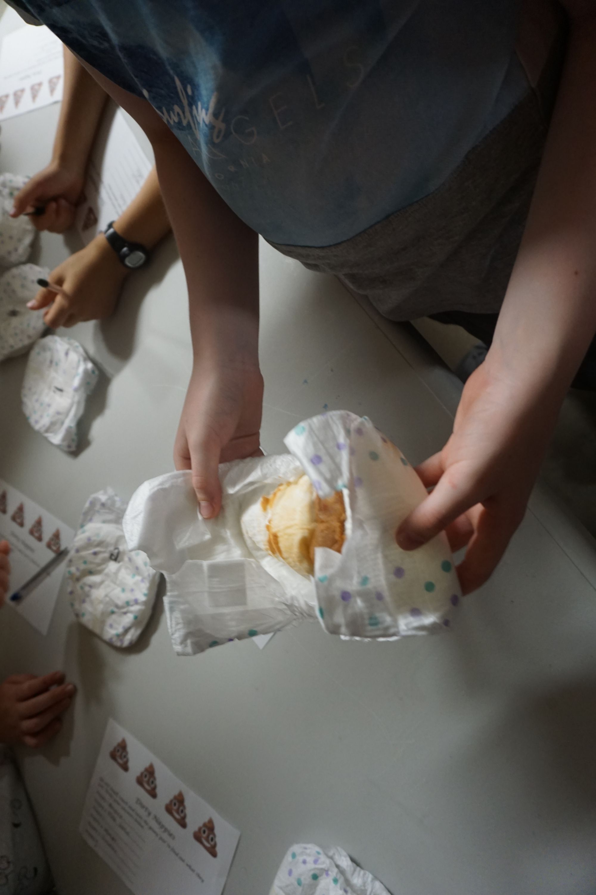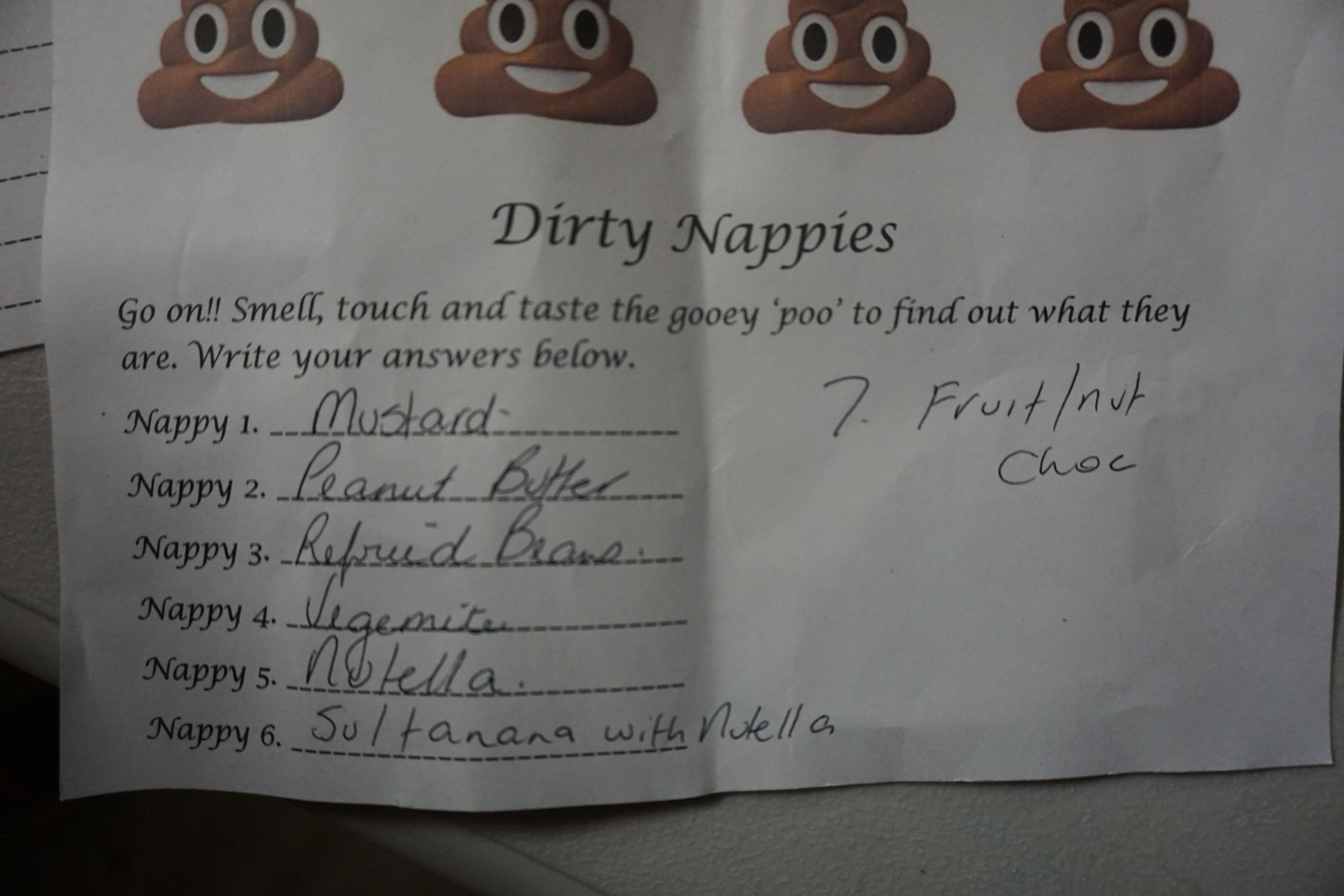 The scouts were presented with a number of nappies that were filled with various foods that looked like poop, the Scouts task to work out what was in each nappy!