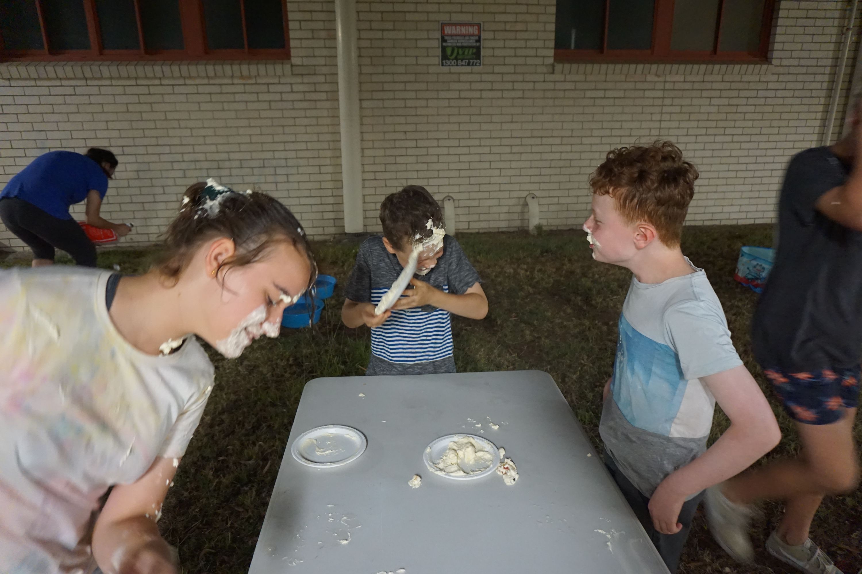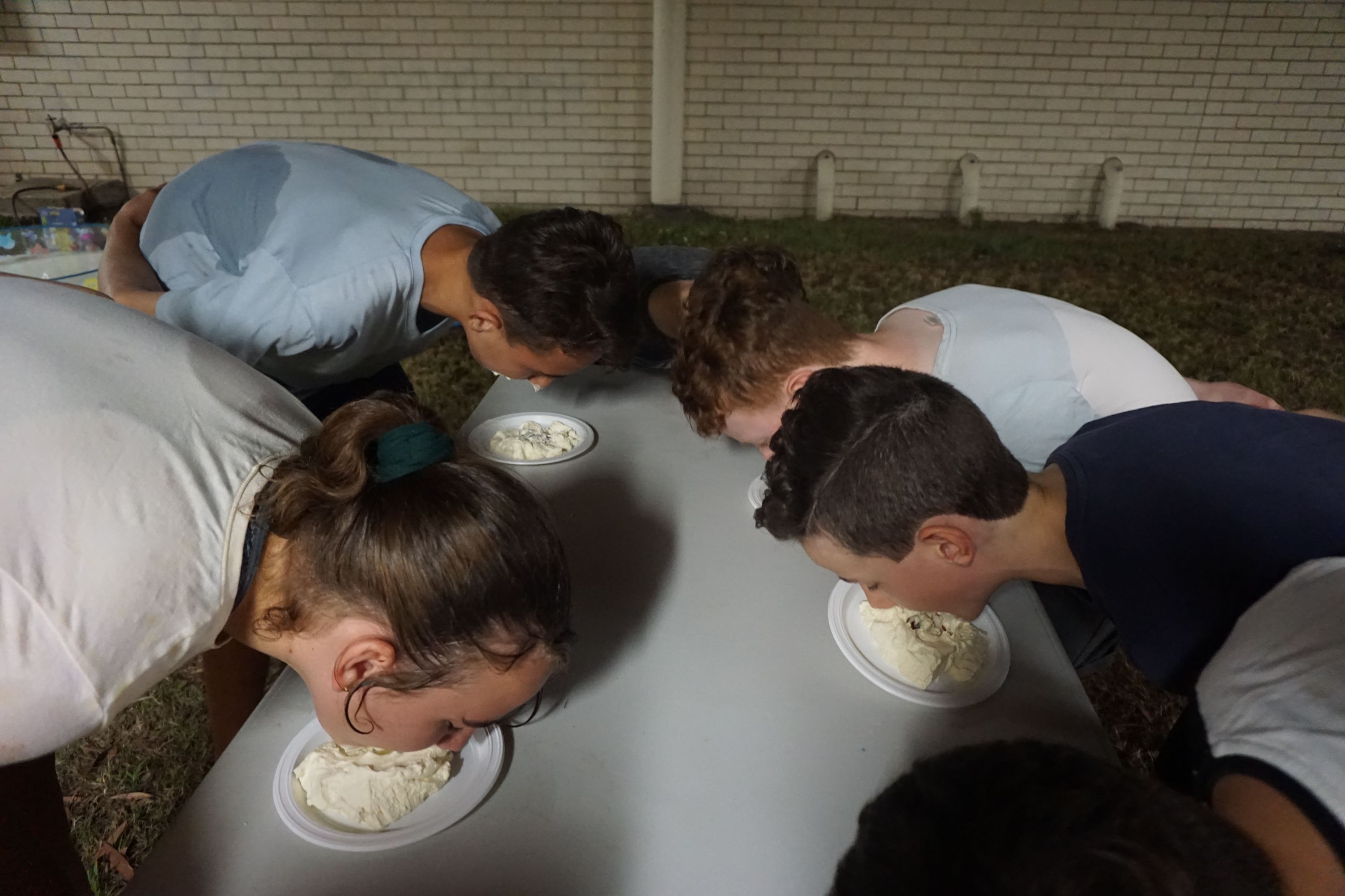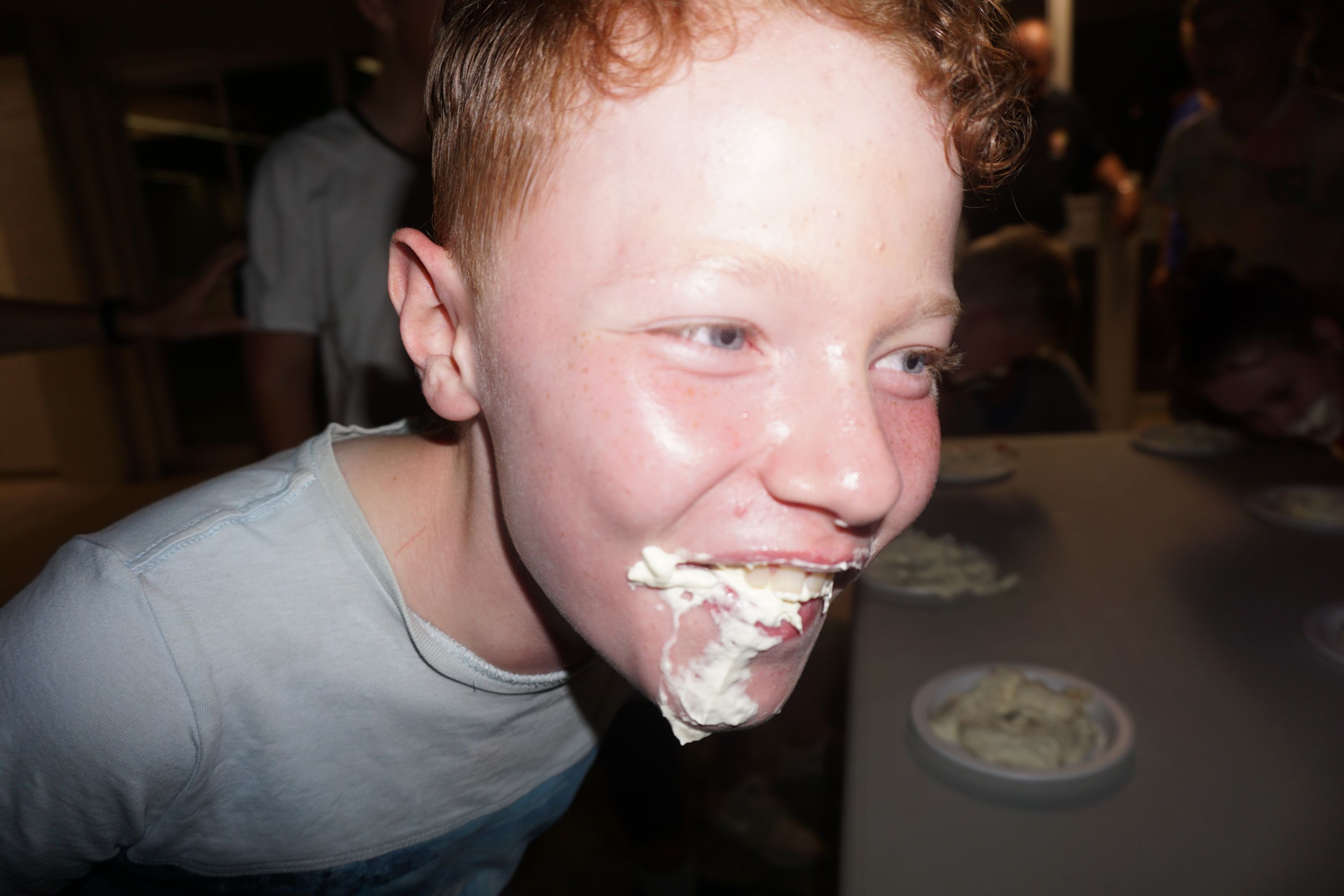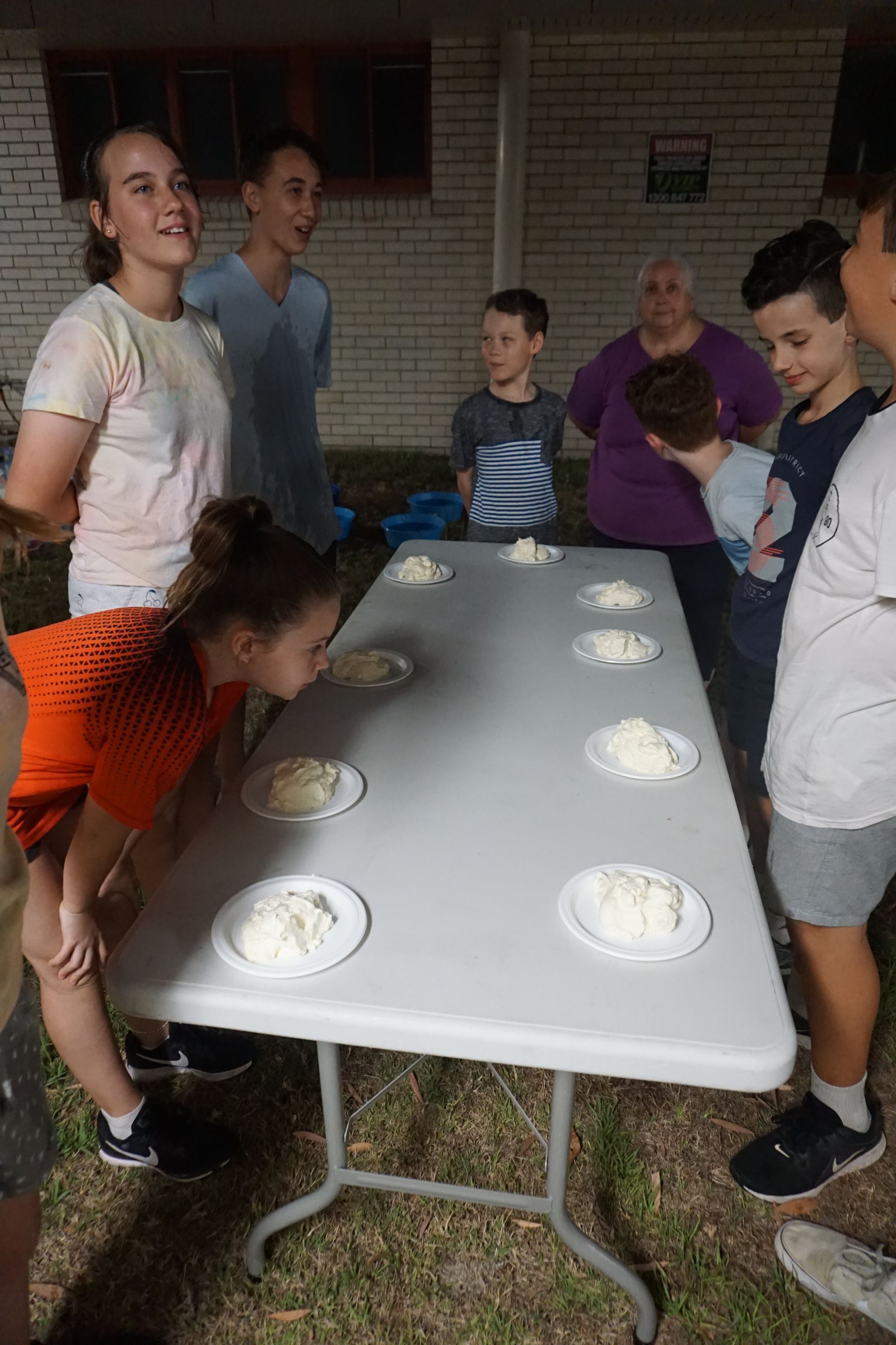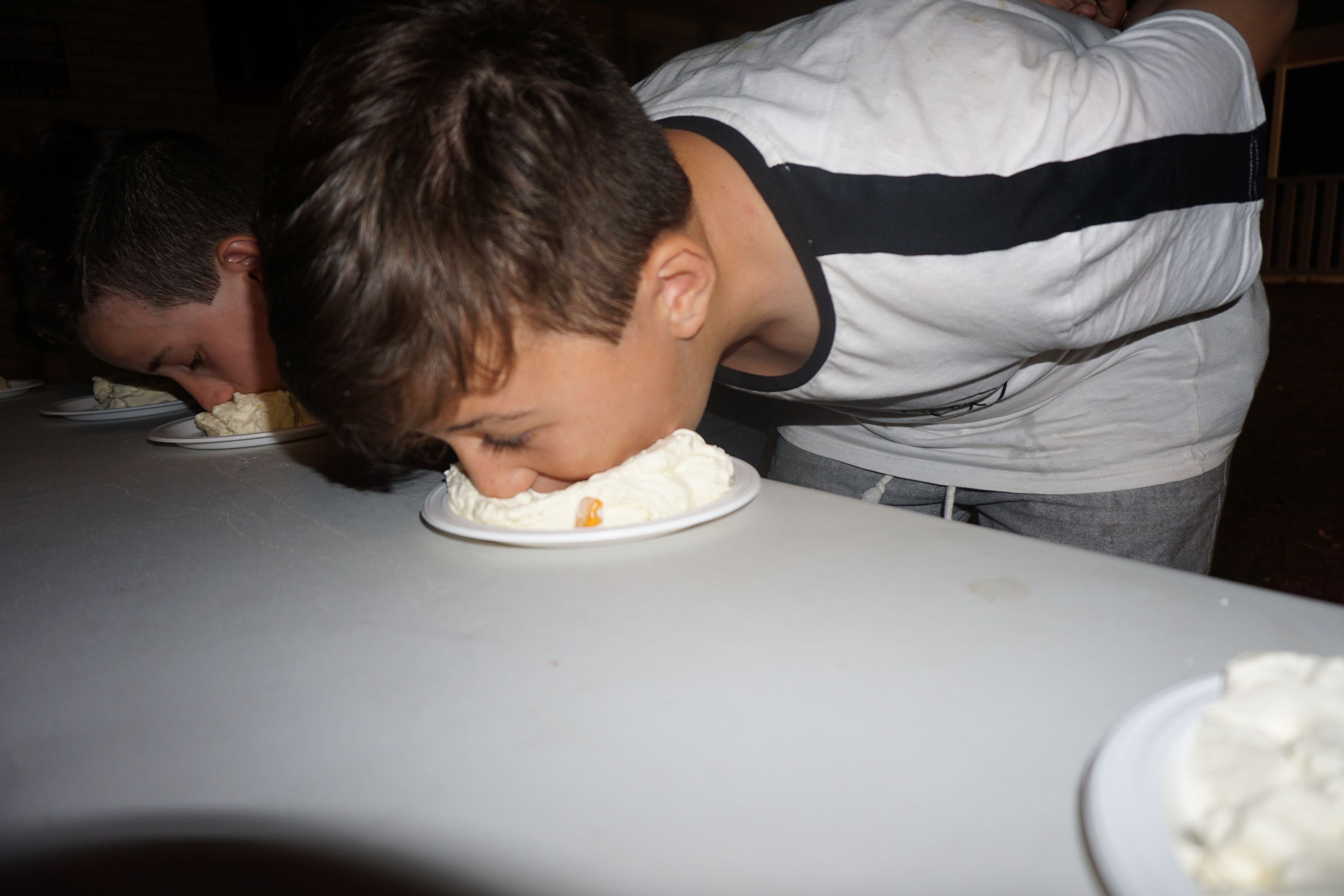 Plates filled with whipped cream and gummy bears, what could be better? The Scouts had to extract all the gummy bears from the cream using only their mouths, oh and faces.
