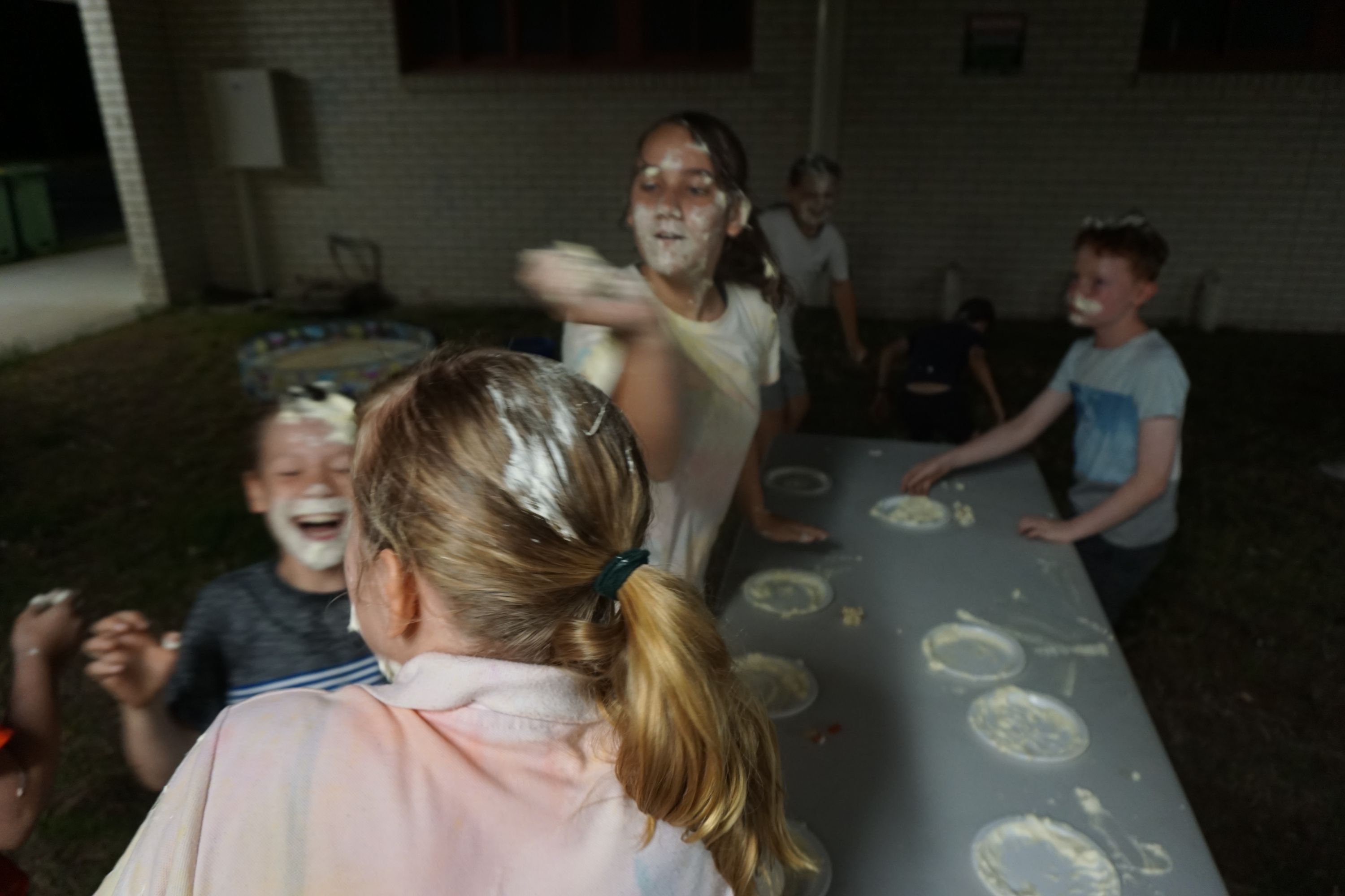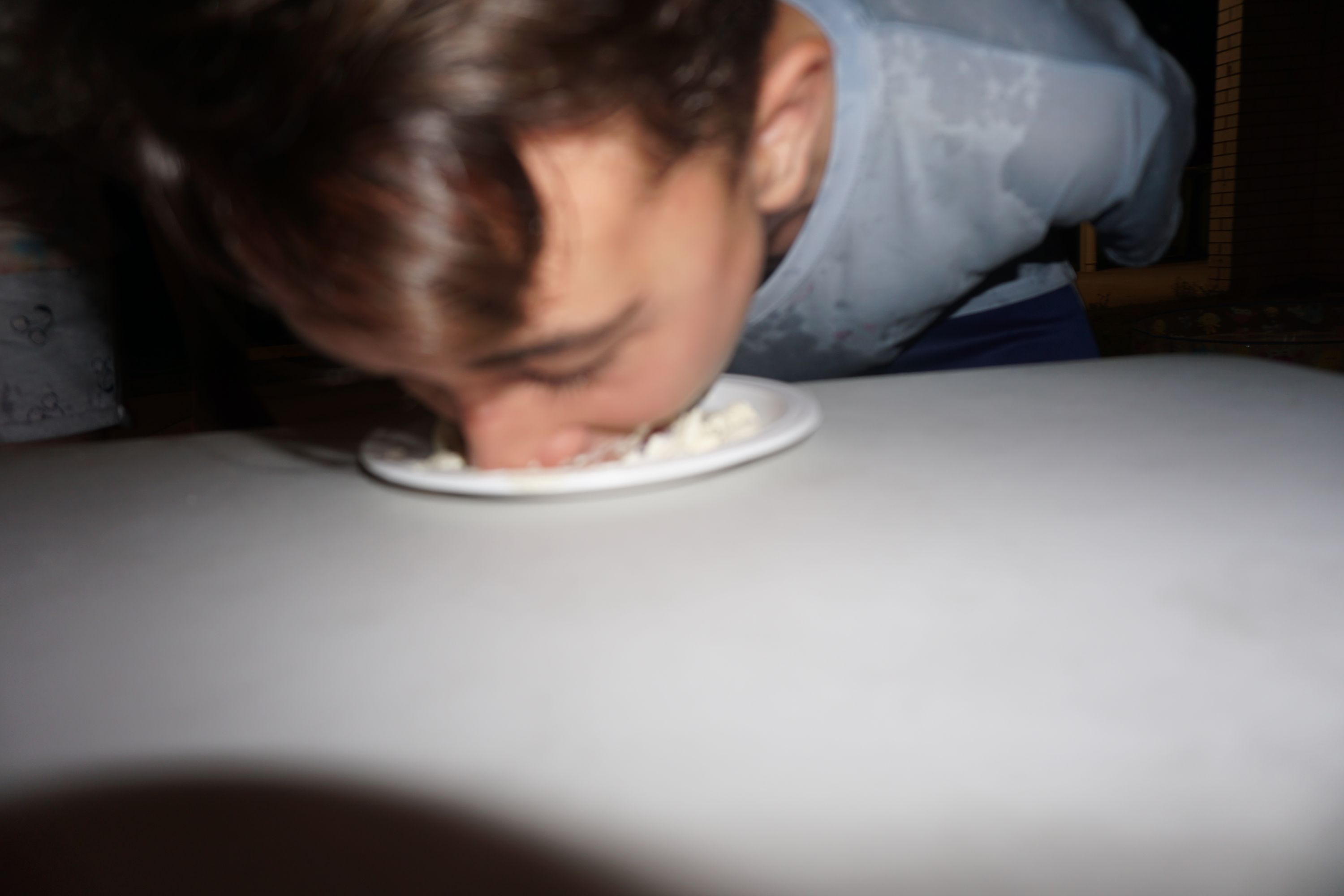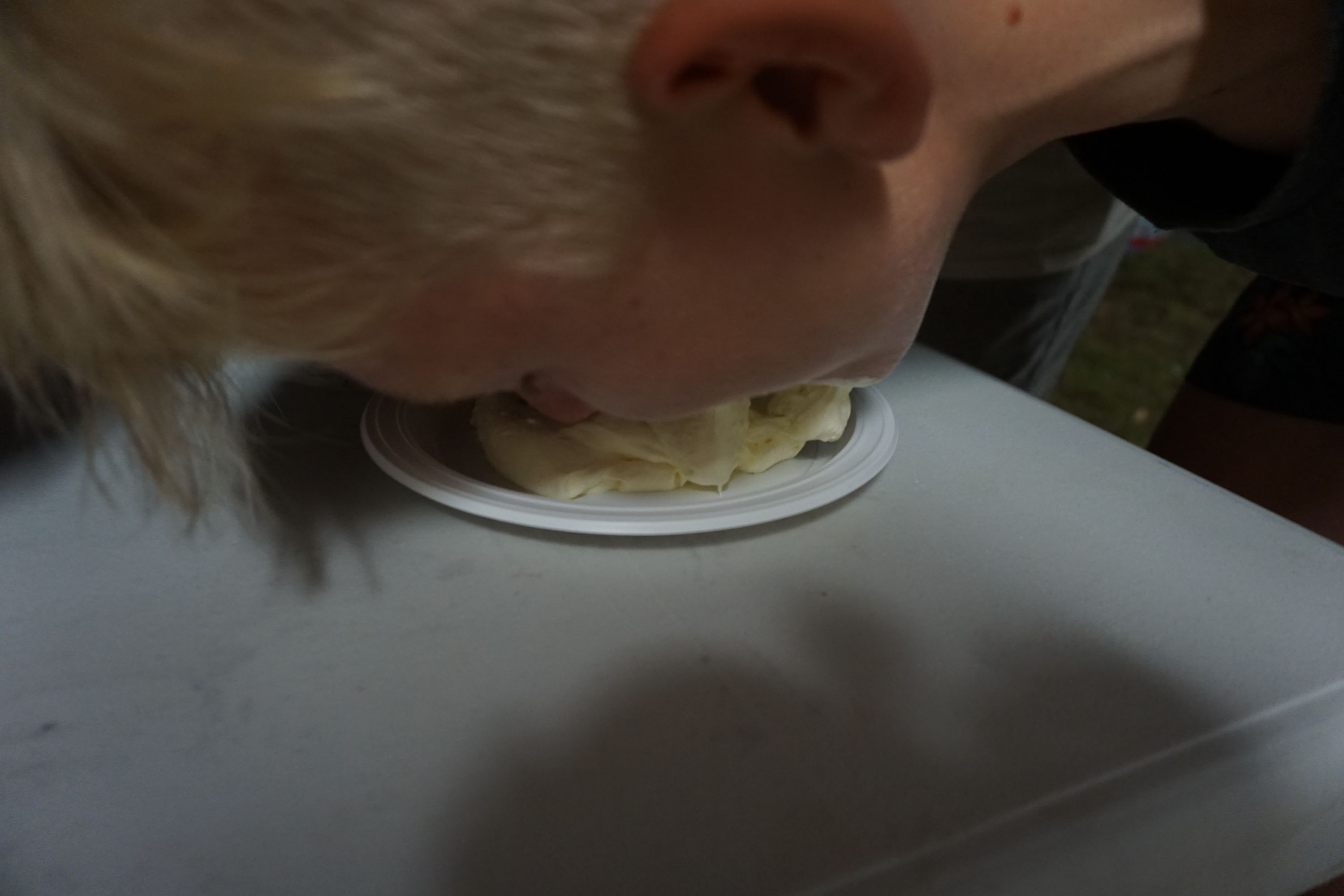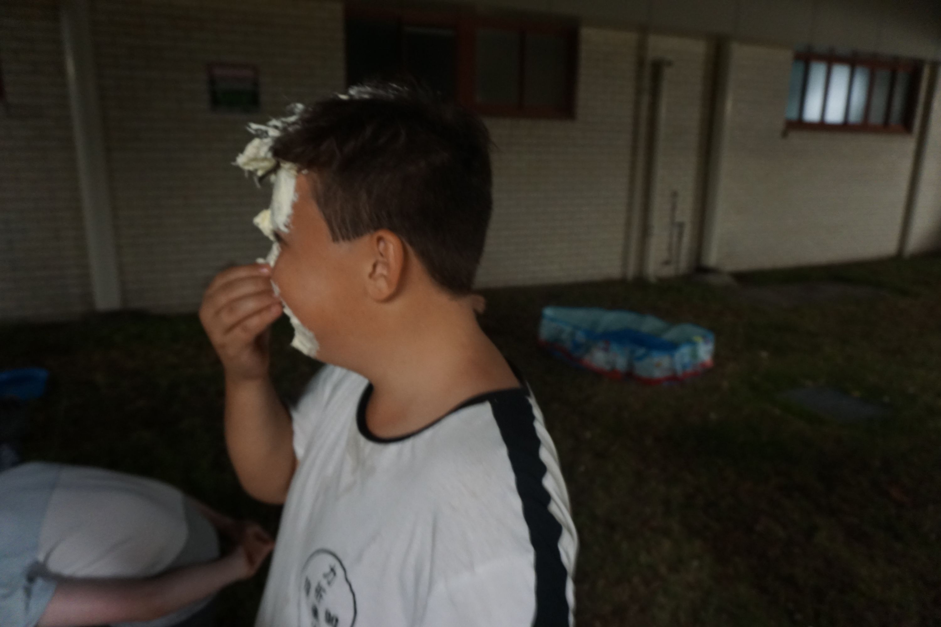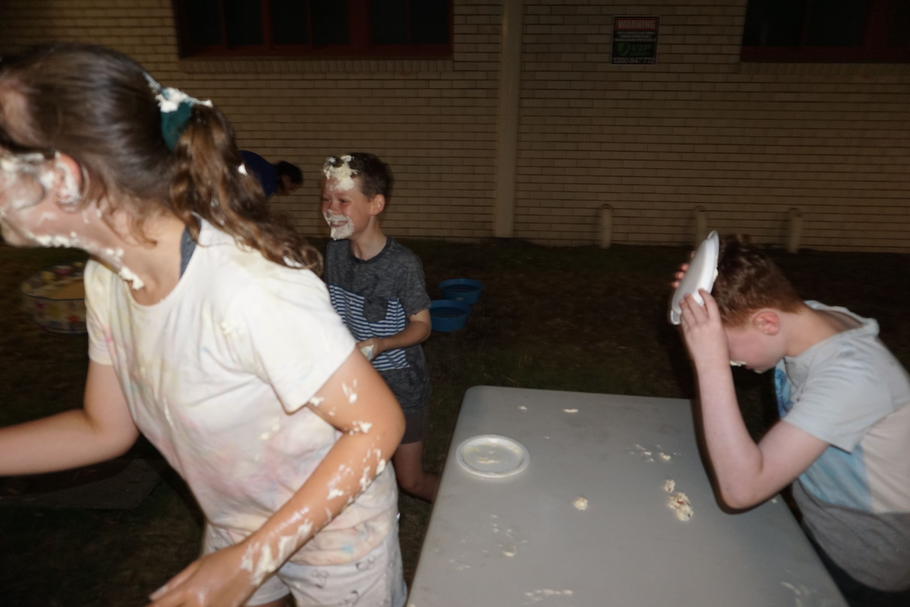 Plates filled with whipped cream and gummy bears, what could be better? The Scouts had to extract all the gummy bears from the cream using only their mouths, oh and faces.